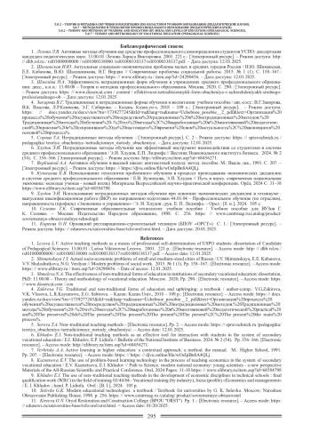 3. Шмелёва Н.А. Эффективность нетрадиционных форм обучения в учреждениях среднего профессионального образования: дисс., к.п.н.: 13.00.08 - Теория и методика профессионального образования. Москва. 2020. С. 290.: [Электронный ресурс]. - Режим доступа: https: //www.dissercat.com / content /effektivnost-netraditsionnykh-form-obucheniya-v-uchrezhdeniyakh-srednego-professionalnogo-ob. - Дата доступа: 12.01.2025.