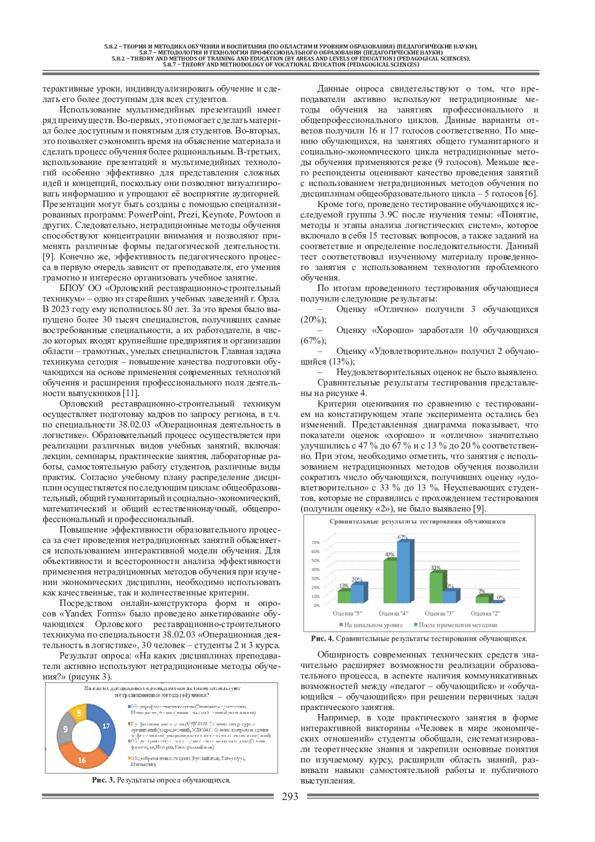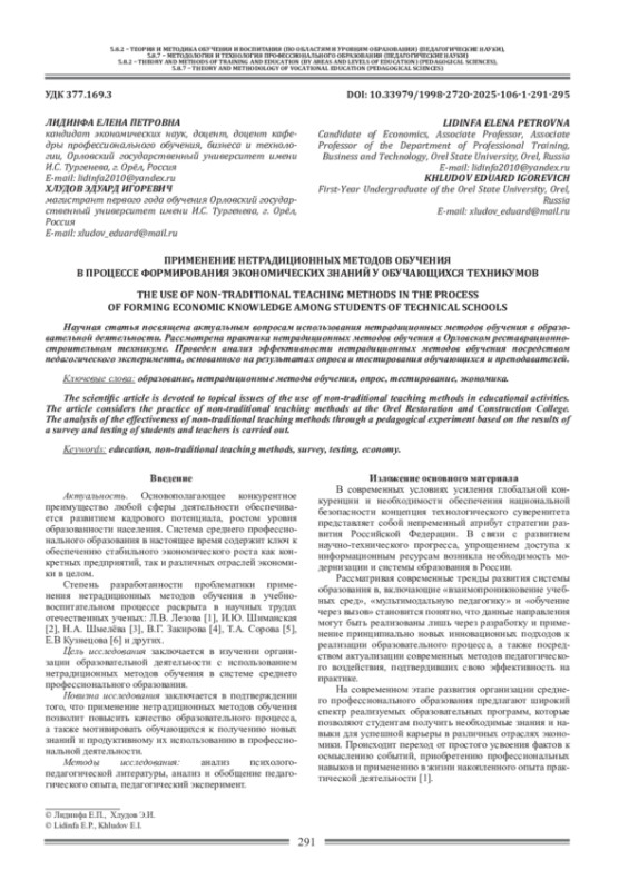 Научная статья посвящена актуальным вопросам использования нетрадиционных методов обучения в образовательной деятельности. Рассмотрена практика нетрадиционных методов обучения в Орловском реставрационно-строительном техникуме. Проведен анализ эффективности нетрадиционных методов обучения посредством педагогического эксперимента, основанного на результатах опроса и тестирования обучающихся и преподавателей.