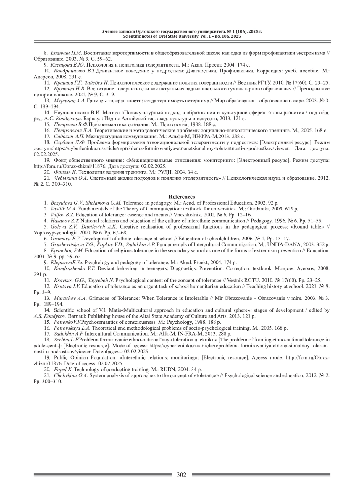 21. Чебыкина О.А. Системный анализ подходов к понятию “толерантность” // Психологическая наука и образование. 2012. № 2. С. 300-310.