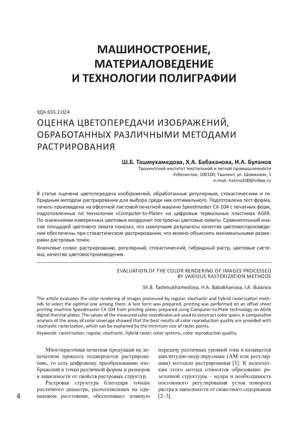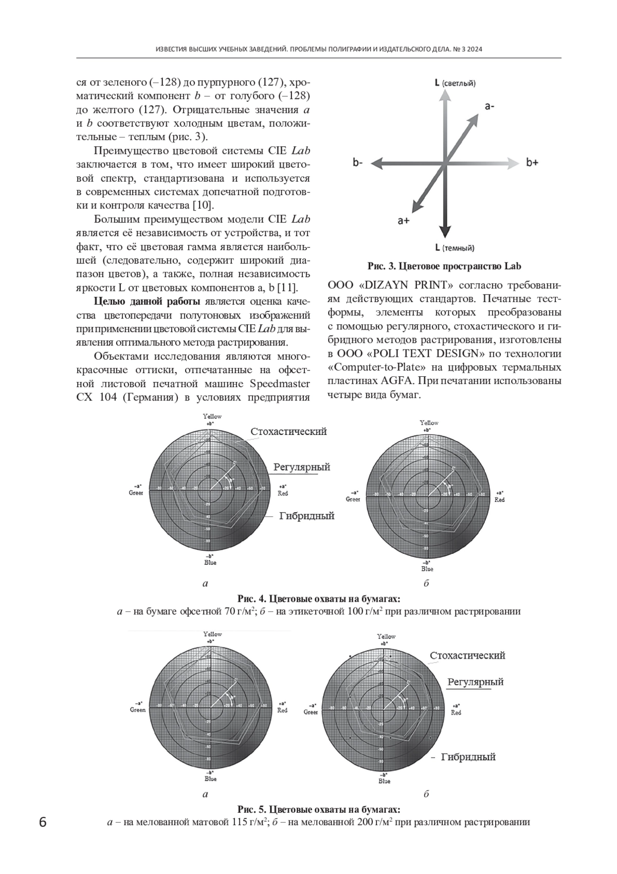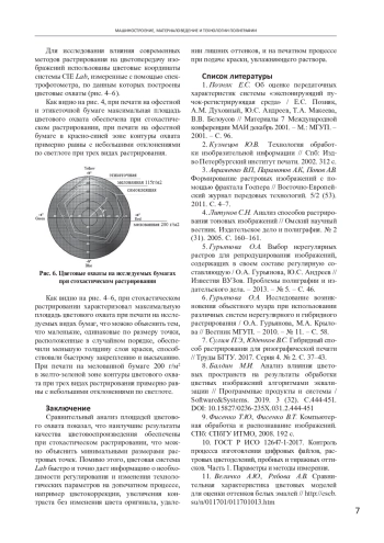 В статье оценена цветопередача изображений, обработанных регулярным, стохастическим и гибридным методом растрирования для выбора среди них оптимального. Подготовлена тест-форма, печать произведена на офсетной листовой печатной машине Speedmaster CХ-104 с печатных форм, подготовленных по технологии «Computer-to-Plate» на цифровых термальных пластинах AGFA. По значениями измеренных цветовых координат построены цветовые охваты. Сравнительный анализ площадей цветового охвата показал, что наилучшие результаты качества цветовоспроизведения обеспечены при стохастическом растрировании, что можно объяснить минимальными размерами растровых точек.