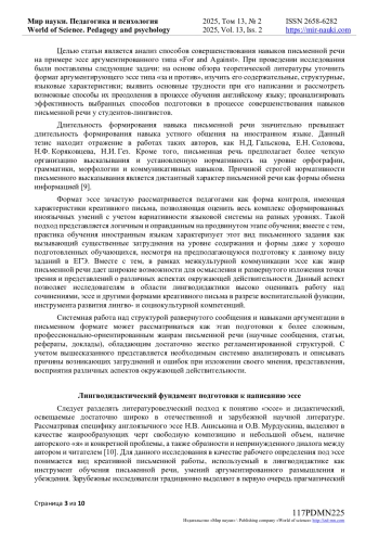 15. Горшкова И.В. Этапы обучения эссе на английском языке в старших профильных классах (из опыта работы) / И.В. Горшкова // Психология и педагогика: методика и проблемы практического применения. - 2008. - № 4-2. - С. 114-117. EDN: RULZKL