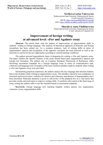 Обобщая практический опыт, авторы анализируют ключевые языковые и структурные элементы, вызывающие ошибки при написании эссе аргументирующего типа. Описаны ошибки, обусловленные несоблюдением структурной и лексической нормативности, нарушением когезии и когерентности, отсутствием аргументов. Особое внимание в статье уделено аспекту самоанализа подготовленного текста как важному фактору, обеспечивающему результативность и мотивацию к совершенствованию речевых умений. Для решения задачи самоконтроля на заключительном этапе работы над эссе авторы предлагают использовать чек-лист, разработанный на основе критериев оценивания.