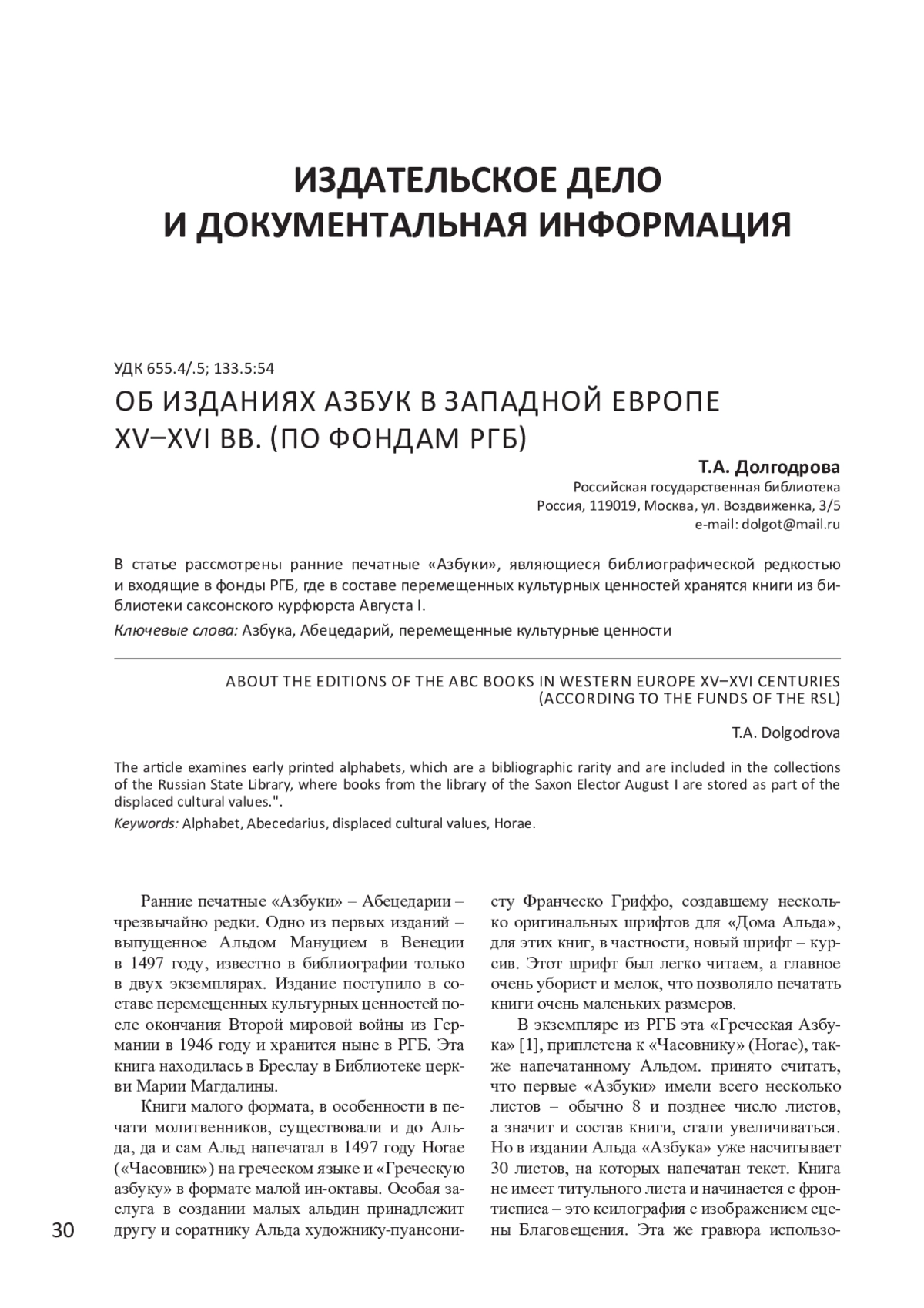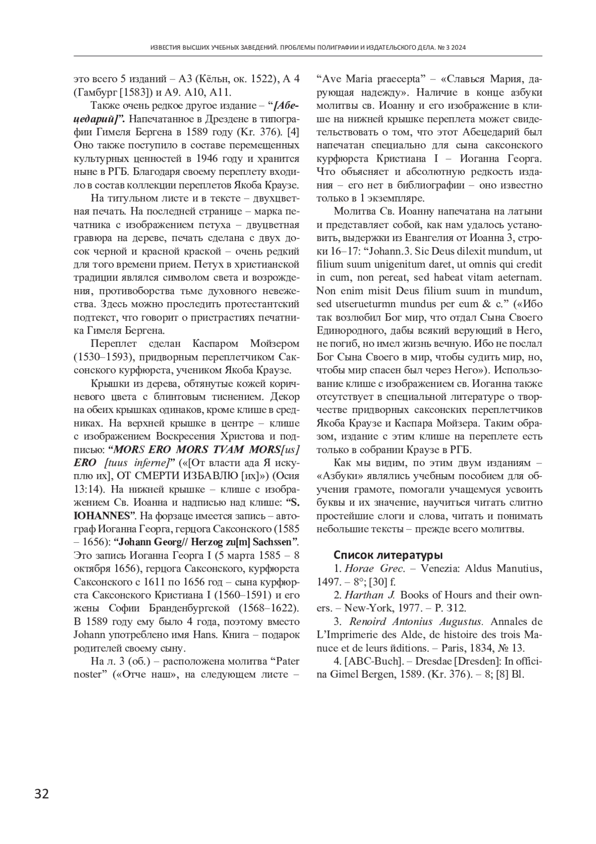 ДОЛГОДРОВА Т. А. ОБ ИЗДАНИЯХ АЗБУК В ЗАПАДНОЙ ЕВРОПЕ XV-XVI ВВ. (ПО ФОНДАМ РГБ) // ИЗВЕСТИЯ ВЫСШИХ УЧЕБНЫХ ЗАВЕДЕНИЙ. ПРОБЛЕМЫ ПОЛИГРАФИИ И ИЗДАТЕЛЬСКОГО ДЕЛА. 2024. № 3