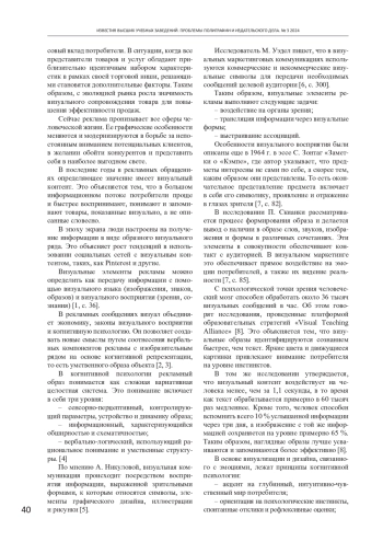 10. Ткаченко О.Н., Марочкина С.С. Специфика визуального исполнения рекламного сообщения [Электронный ресурс] // ОНВ. 2013. № 1 (115). С. 212-214. ЭБС “КиберЛенинка”. URL: https://cyberleninka.ru/article/n/spetsifika-vizualnogo-ispolneniya-reklamnogo-soobscheniya (Дата обращения 25.06.2024). EDN: QILERN