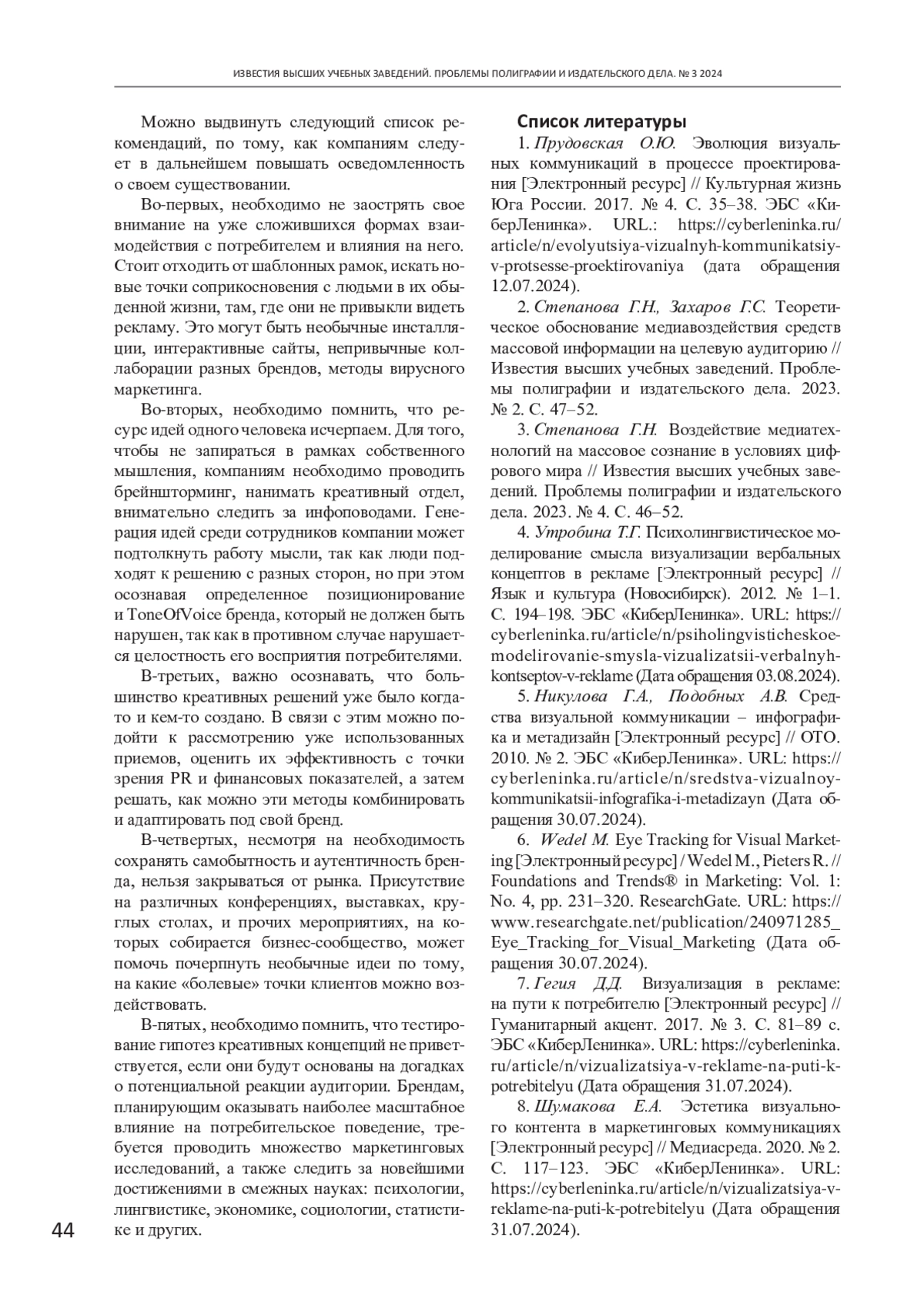 3. Степанова Г.Н. Воздействие медиатехнологий на массовое сознание в условиях цифрового мира // Известия высших учебных заведений. Проблемы полиграфии и издательского дела. 2023. № 4. С. 46-52. EDN: WBYINI