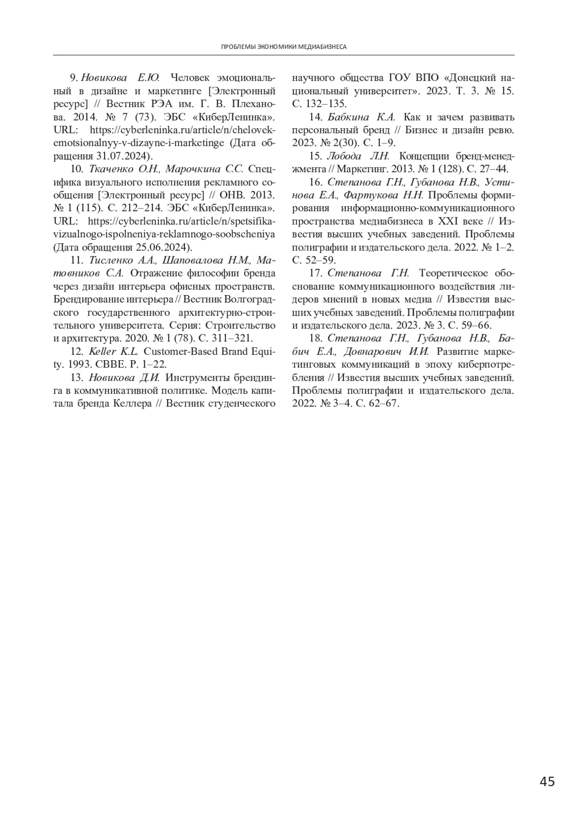 18. Степанова Г.Н., Губанова Н.В., Бабич Е.А., Довнарович И.И. Развитие маркетинговых коммуникаций в эпоху киберпотребления // Известия высших учебных заведений. Проблемы полиграфии и издательского дела. 2022. № 3-4. С. 62-67. EDN: CLNQPB