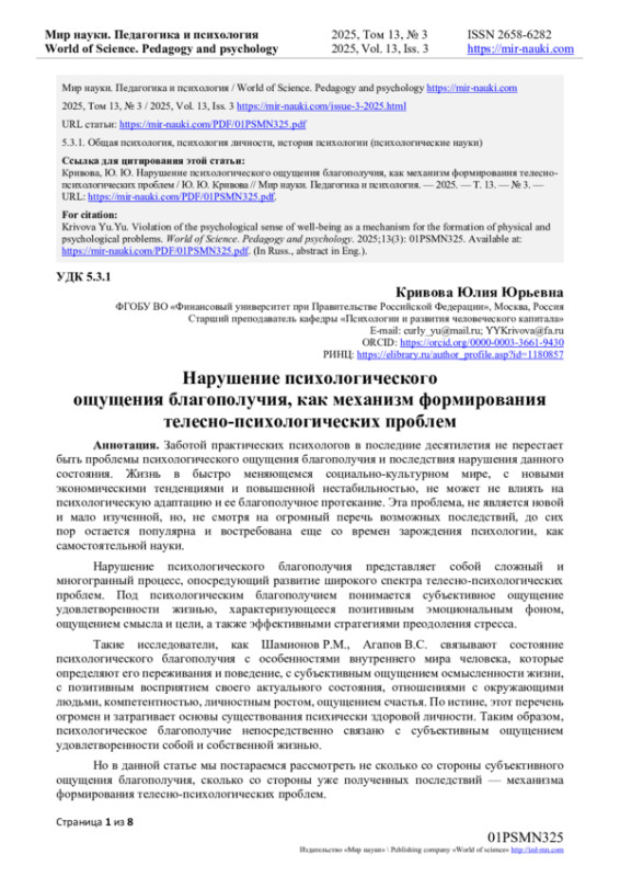 Нарушение психологического благополучия представляет собой сложный и многогранный процесс, опосредующий развитие широкого спектра телесно-психологических проблем. Под психологическим благополучием понимается субъективное ощущение удовлетворенности жизнью, характеризующееся позитивным эмоциональным фоном, ощущением смысла и цели, а также эффективными стратегиями преодоления стресса.