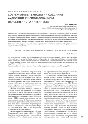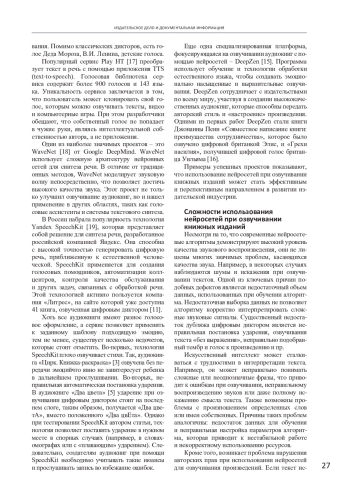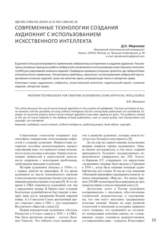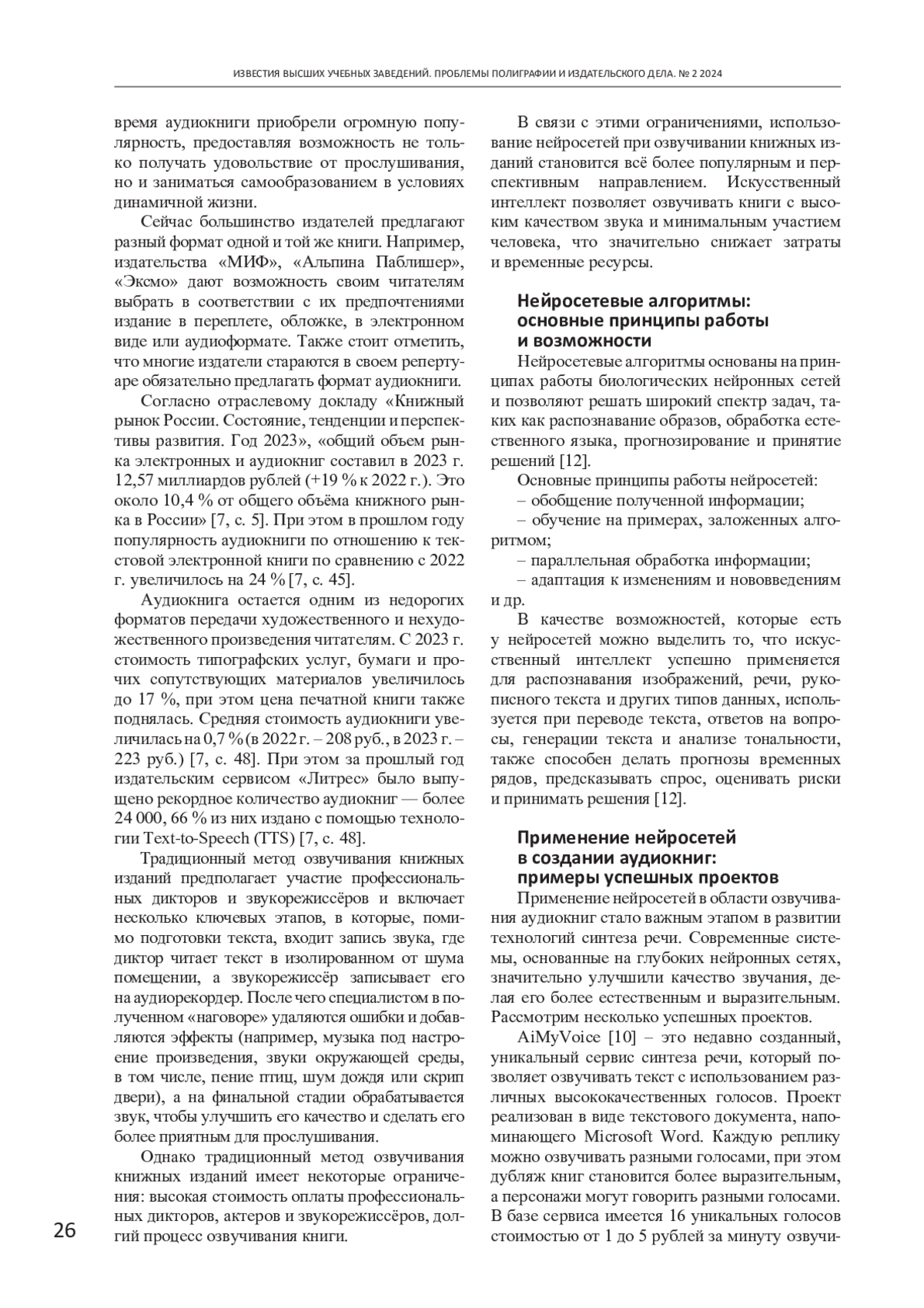 В данной статье рассматривается применение нейросетевых алгоритмов в создании аудиокниг. Рассмотрены основные принципы работы нейросетей и возможности использования искусственного интеллекта (ИИ) для озвучивания книжных изданий. Приведены примеры успешных проектов, где нейросетевые алгоритмы были применены. Рассмотрены проблемы, связанные с использованием нейросетей при озвучивании книжных изданий, такие как качество звука, интерпретация текста и авторские права.