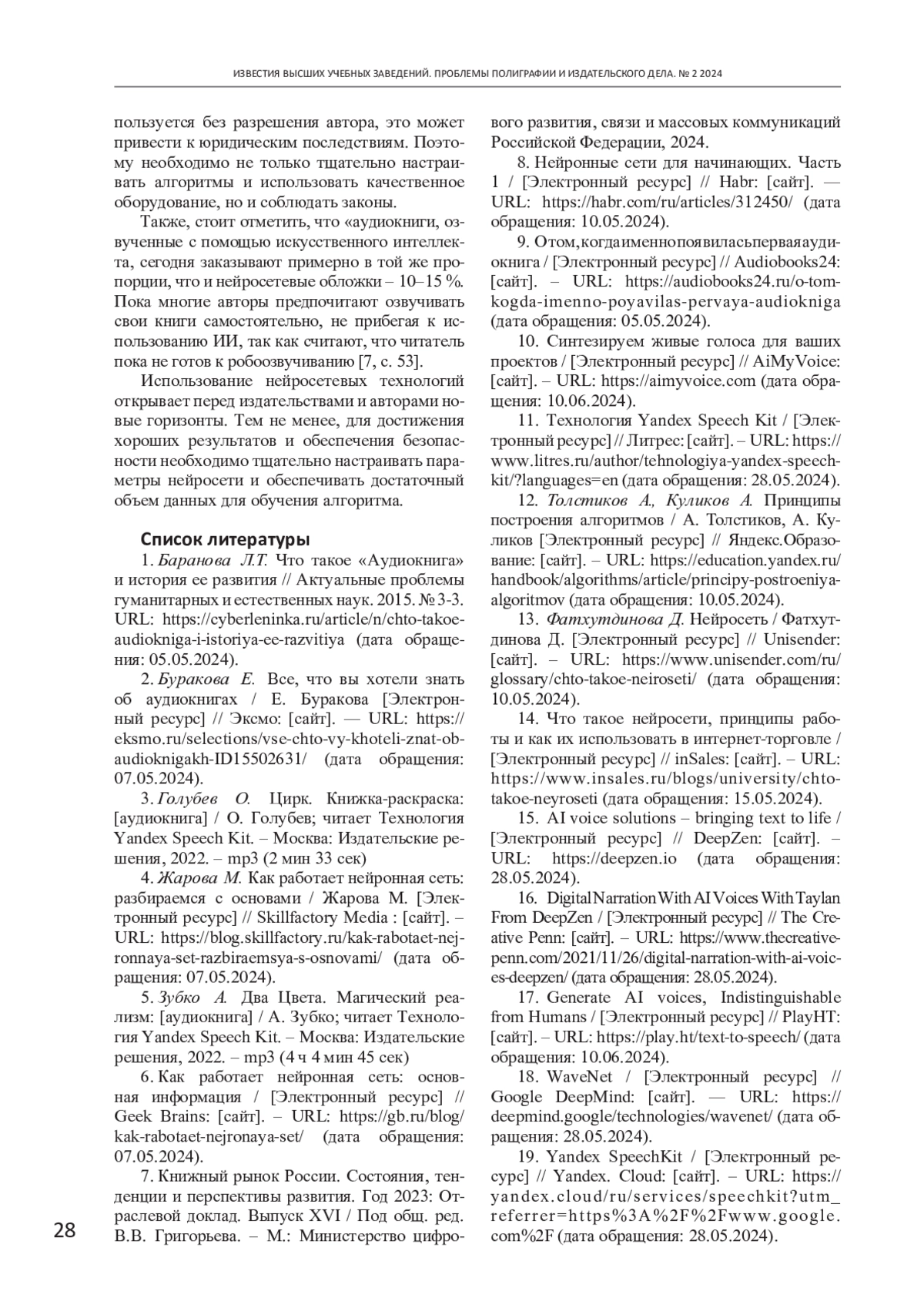 1. Баранова Л.Т. Что такое “Аудиокнига” и история ее развития // Актуальные проблемы гуманитарных и естественных наук. 2015. № 3-3. URL: https://cyberleninka.ru/article/n/chto-takoe-audiokniga-i-istoriya-ee-razvitiya (дата обращения: 05.05.2024). EDN: TPGQQH