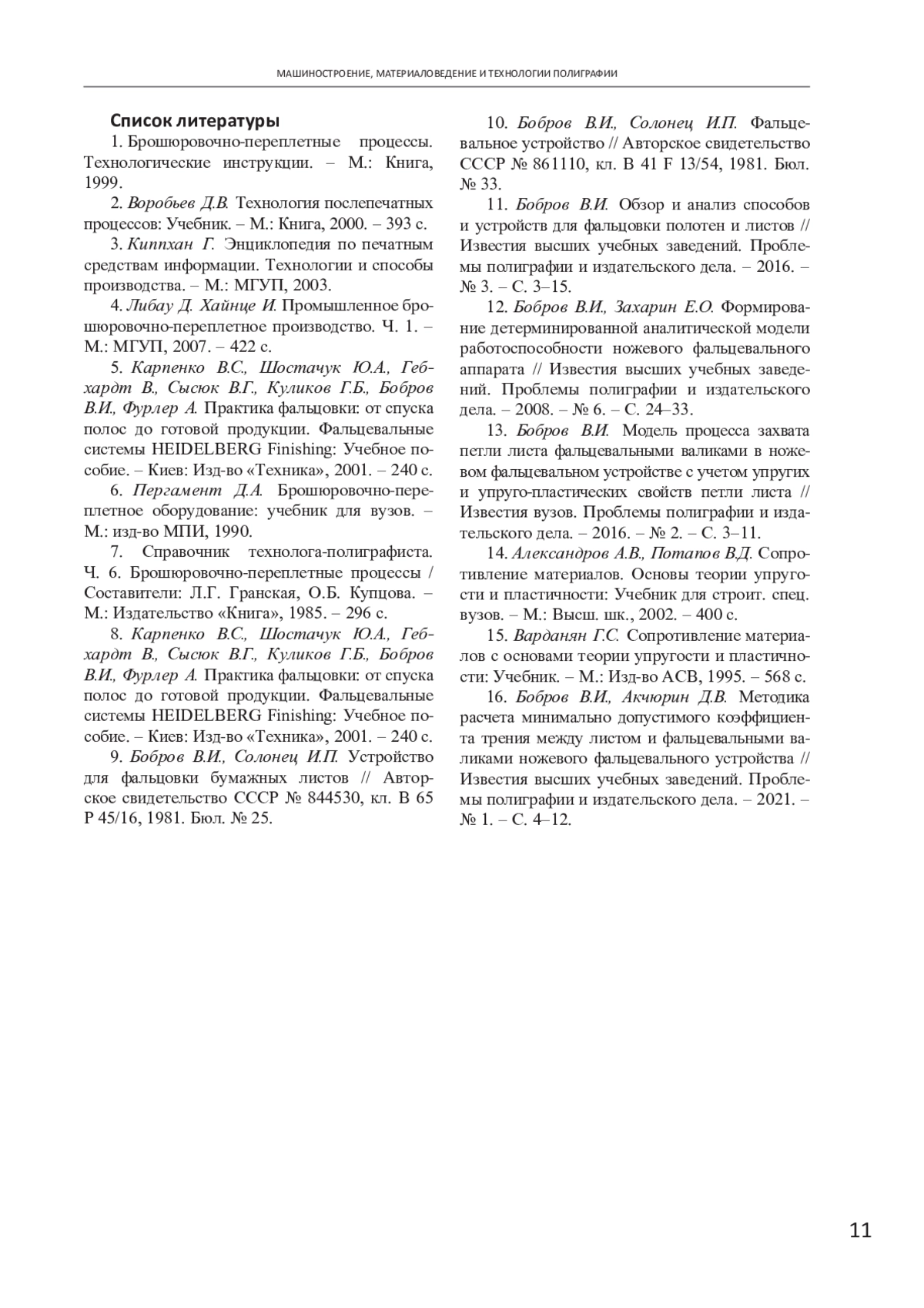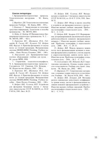 11. Бобров В.И. Обзор и анализ способов и устройств для фальцовки полотен и листов // Известия высших учебных заведений. Проблемы полиграфии и издательского дела. - 2016. - № 3. - С. 3-15. EDN: WGBNHF
