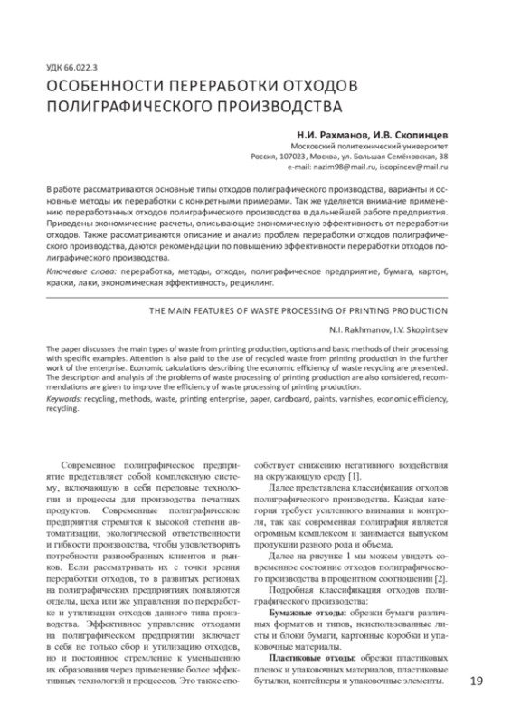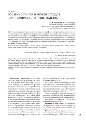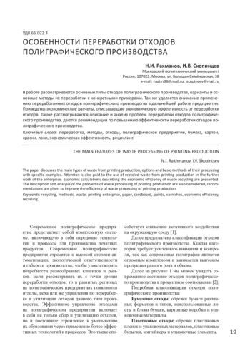 В работе рассматриваются основные типы отходов полиграфического производства, варианты и основные методы их переработки с конкретными примерами. Так же уделяется внимание применению переработанных отходов полиграфического производства в дальнейшей работе предприятия. Приведены экономические расчеты, описывающие экономическую эффективность от переработки отходов. Также рассматриваются описание и анализ проблем переработки отходов полиграфического производства, даются рекомендации по повышению эффективности переработки отходов полиграфического производства.
