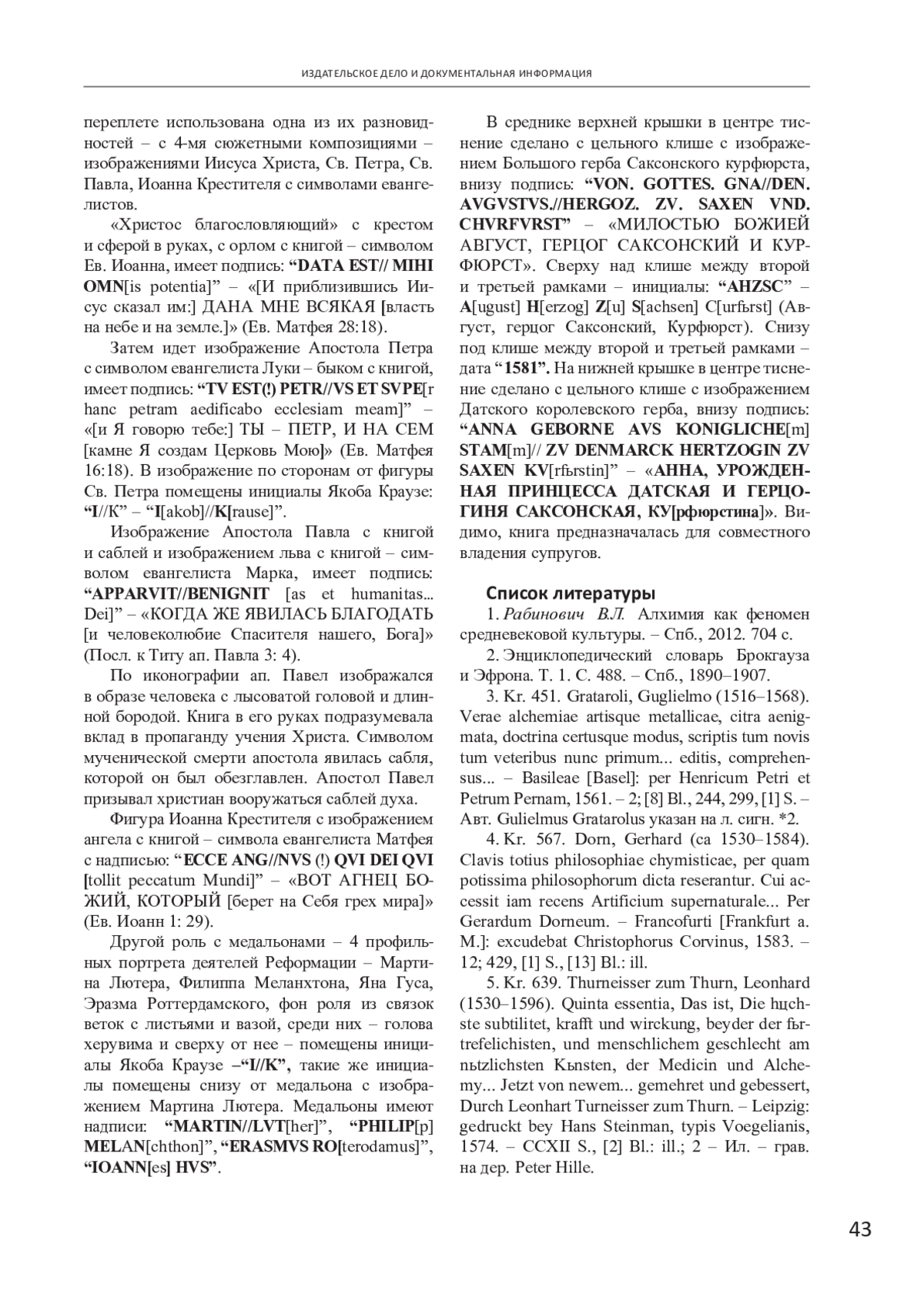 1. Рабинович В.Л. Алхимия как феномен средневековой культуры. - Спб., 2012. 704 с. EDN: QKDCML