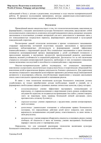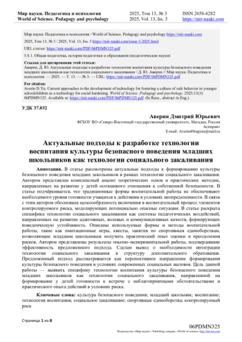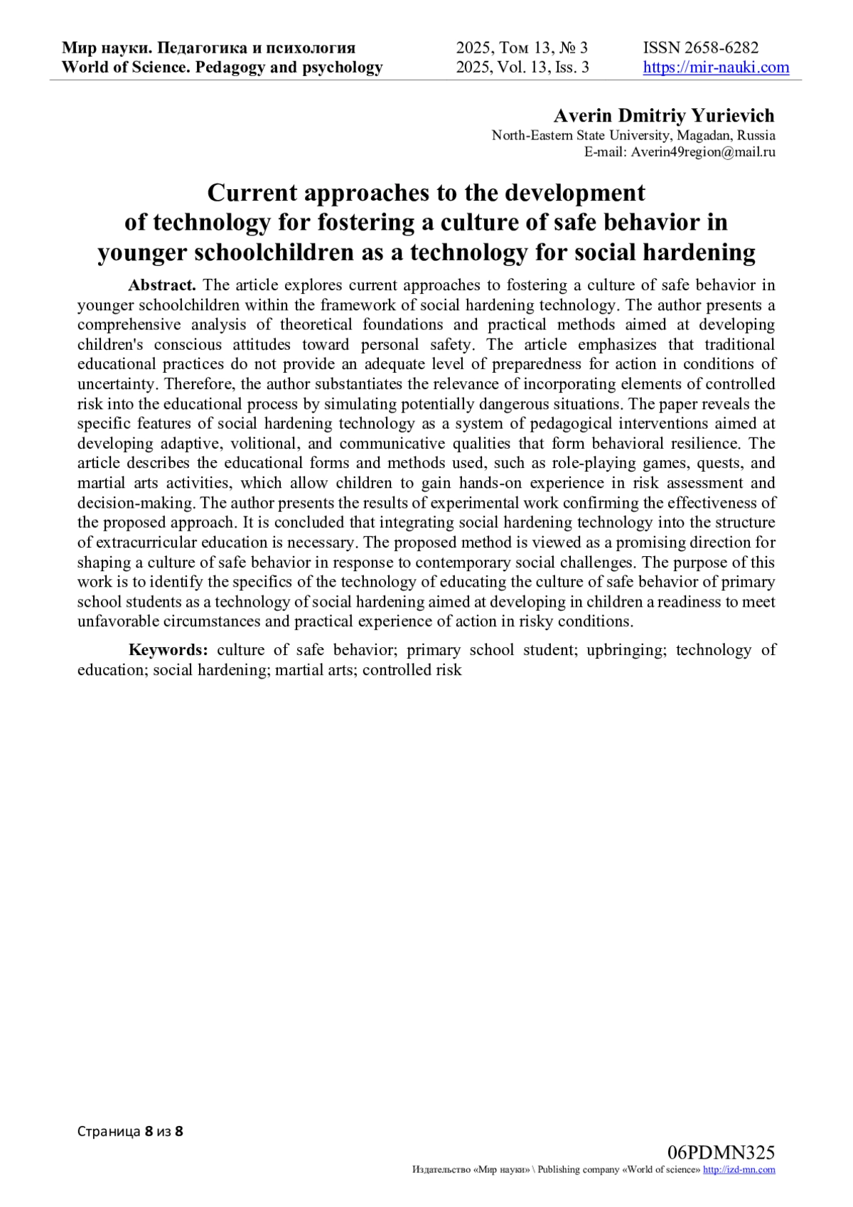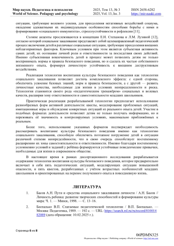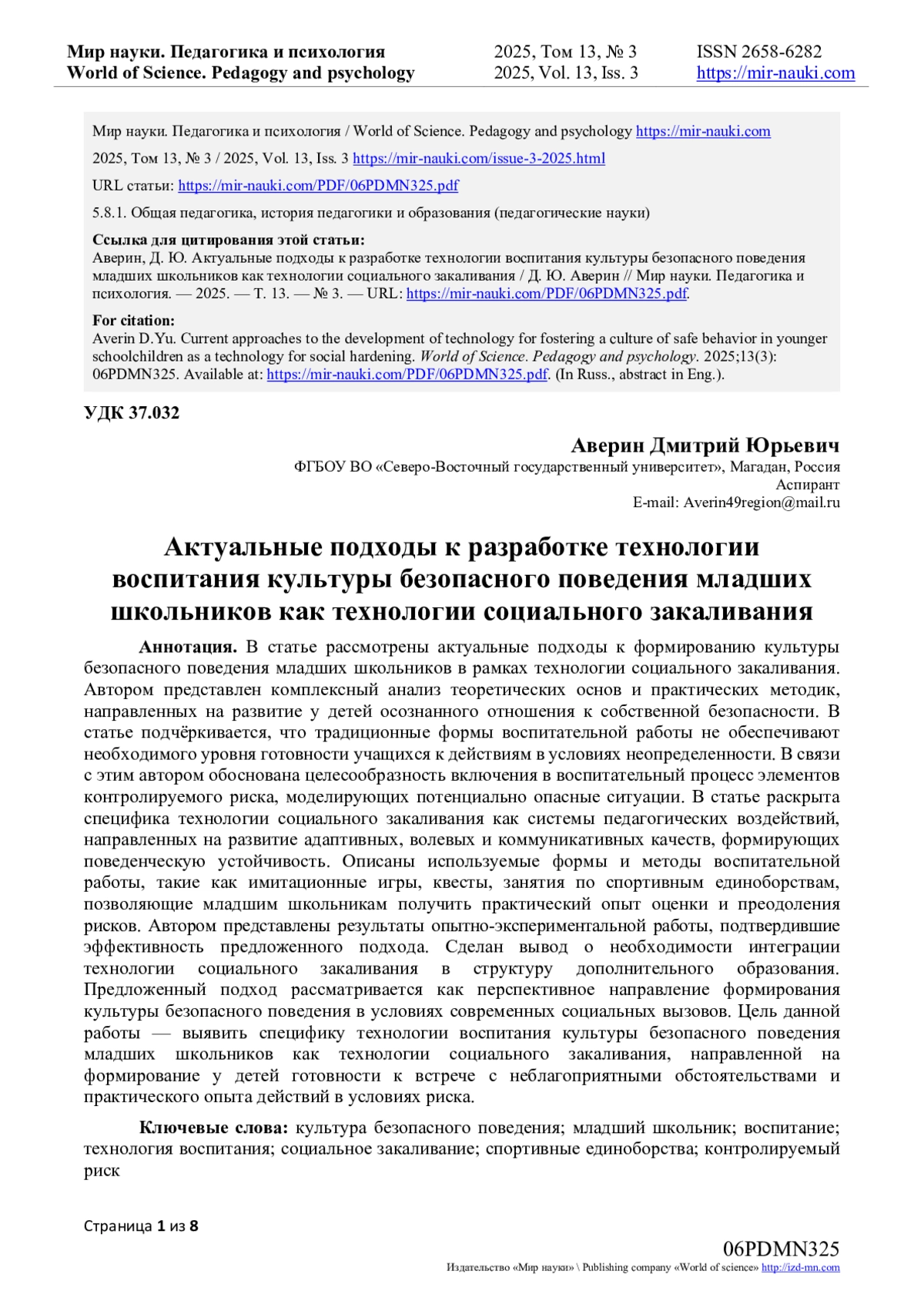 В статье рассмотрены актуальные подходы к формированию культуры безопасного поведения младших школьников в рамках технологии социального закаливания. Автором представлен комплексный анализ теоретических основ и практических методик, направленных на развитие у детей осознанного отношения к собственной безопасности. В статье подчёркивается, что традиционные формы воспитательной работы не обеспечивают необходимого уровня готовности учащихся к действиям в условиях неопределенности. В связи с этим автором обоснована целесообразность включения в воспитательный процесс элементов контролируемого риска, моделирующих потенциально опасные ситуации. В статье раскрыта специфика технологии социального закаливания как системы педагогических воздействий, направленных на развитие адаптивных, волевых и коммуникативных качеств, формирующих поведенческую устойчивость. Описаны используемые формы и методы воспитательной работы, такие как имитационные игры, квесты, занятия по спортивным единоборствам, позволяющие младшим школьникам получить практический опыт оценки и преодоления рисков. Автором представлены результаты опытно-экспериментальной работы, подтвердившие эффективность предложенного подхода.