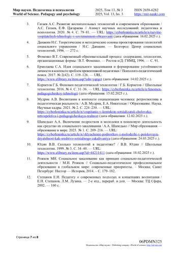 8. Мудрик А.В. Воспитание в контексте социализации человека: ретроспектива и педагогическая реальность / А.В. Мудрик, Е.А. Никитская // Образование. Наука. Научные кадры. 2021. № 2. С. 224-230. - URL: https://cyberleninka.ru/article/n/vospitanie-v-kontekste-sotsializatsii-cheloveka-retrospektiva-i-pedagogicheskaya-realnost (дата обращения: 12.02.2025 г.). EDN: YPNRZS