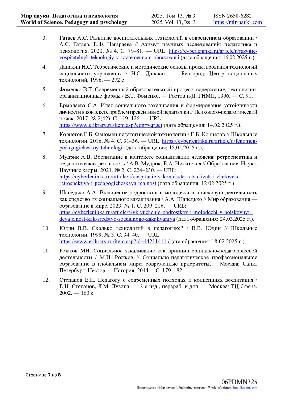 6. Ермолаева С.А. Идея социального закаливания и формирование устойчивости личности в контексте проблем превентивной педагогики // Психолого-педагогический поиск. 2017. № 2(42). С. 119-126. - URL: item.asp?edn= (дата обращения: 14.02.2025 г.). EDN: YQRGCT