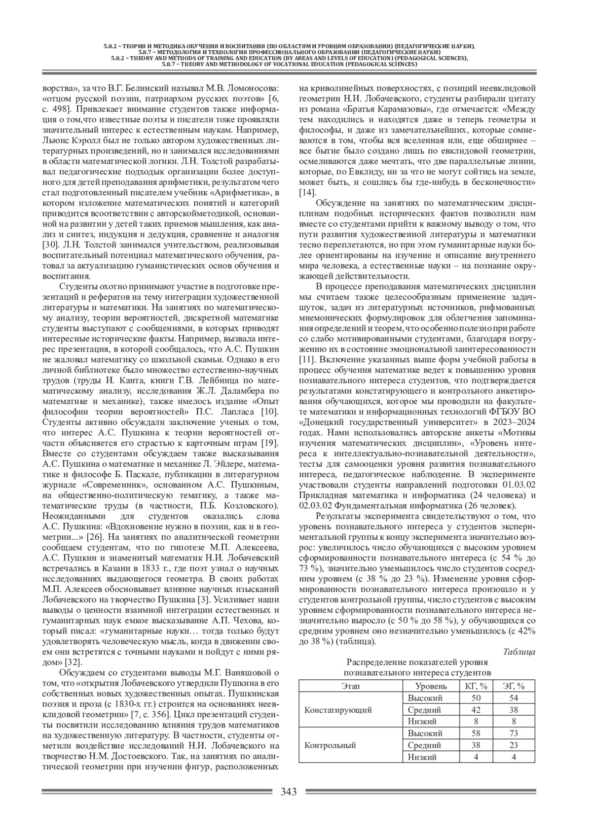 На протяжении многих веков естественные и гуманитарные науки развиваются, взаимодополняя и взаимно-обогащая друг друга. Эти две социокультурные сферы человеческого знания объединяет то, что через них человек глубже познает окружающий мир, его общественные и физические законы. Поэтому изучение взаимной интеграции научных знаний в указанных сферах как эффективного средства развития личности обучающихся широко изучается в современной педагогике. Однако вопрос о возможностях влияния взаимной интеграции естественнонаучных дисциплин и художественной литературы на развитие познавательного интереса обучающихся еще недостаточно изучен