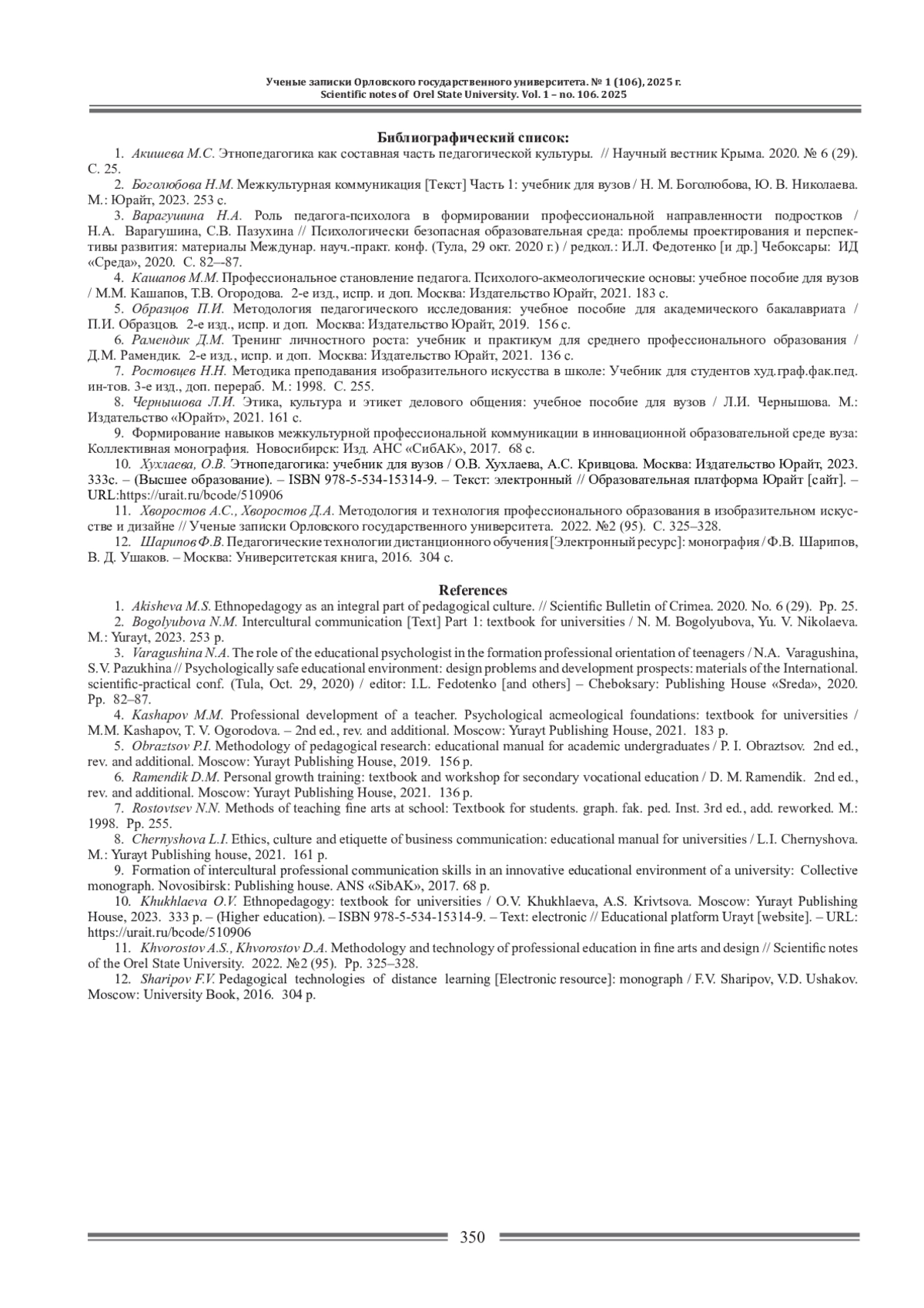 11. Хворостов А.С., Хворостов Д.А. Методология и технология профессионального образования в изобразительном искусстве и дизайне // Ученые записки Орловского государственного университета. 2022. №2 (95). С. 325-328.