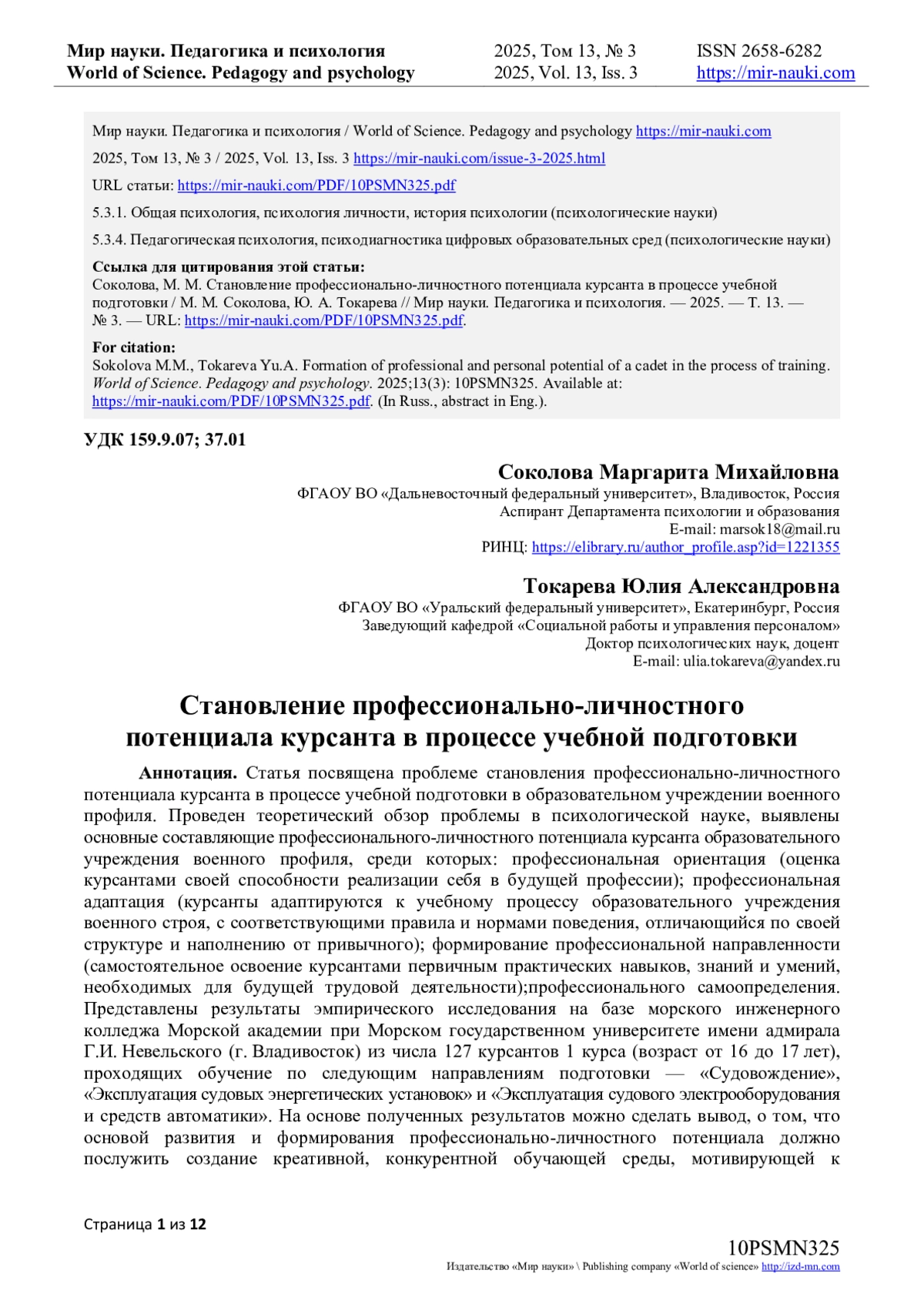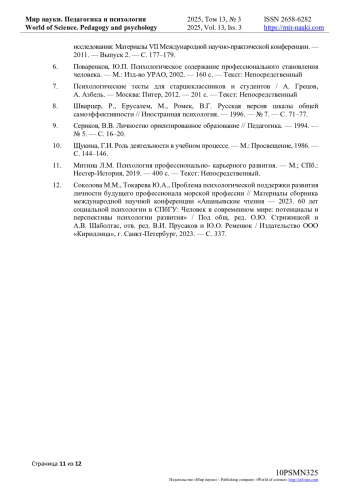 12. Соколова М.М., Токарева Ю.А., Проблема психологической поддержки развития личности будущего профессионала морской профессии // Материалы сборника международной научной конференции “Ананьевские чтения - 2023. 60 лет социальной психологии в СПбГУ: Человек в современном мире: потенциалы и перспективы психологии развития” / Под общ. ред. О.Ю. Стрижицкой и А.В. Шаболтас, отв. ред. В.И. Прусаков и Ю.О. Ременюк / Издательство ООО “Кириллица”, г. Санкт-Петербург, 2023. - С. 337. EDN: GNKSUH