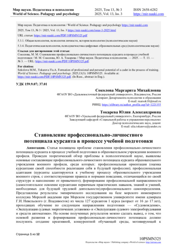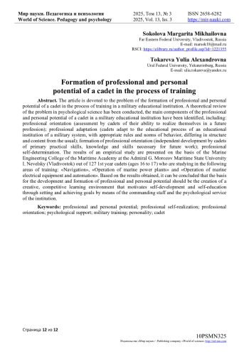 Статья посвящена проблеме становления профессионально-личностного потенциала курсанта в процессе учебной подготовки в образовательном учреждении военного профиля. Проведен теоретический обзор проблемы в психологической науке, выявлены основные составляющие профессионального-личностного потенциала курсанта образовательного учреждения военного профиля, среди которых: профессиональная ориентация (оценка курсантами своей способности реализации себя в будущей профессии); профессиональная адаптация (курсанты адаптируются к учебному процессу образовательного учреждения военного строя, с соответствующими правила и нормами поведения, отличающийся по своей структуре и наполнению от привычного); формирование профессиональной направленности (самостоятельное освоение курсантами первичным практических навыков, знаний и умений, необходимых для будущей трудовой деятельности); профессионального самоопределения. Представлены результаты эмпирического исследования на базе морского инженерного колледжа Морской академии при Морском государственном университете имени адмирала Г. И. Невельского (г. Владивосток) из числа 127 курсантов 1 курса (возраст от 16 до 17 лет), проходящих обучение по следующим направлениям подготовки - «Судовождение», «Эксплуатация судовых энергетических установок» и «Эксплуатация судового электрооборудования и средств автоматики». На основе полученных результатов можно сделать вывод, о том, что основой развития и формирования профессионально-личностного потенциала должно послужить создание креативной, конкурентной обучающей среды, мотивирующей к саморазвитию и самообразованию через постановку и достижение целей средствами командующего состава и психологической службы учреждения.