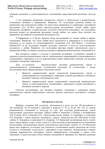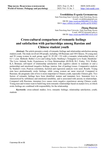 В статье представлены результаты изучения романтических чувств и удовлетворенности партнерскими отношениями студенческой молодежи. В исследовании приняли участие 200 человек, из них 100 россиян и 100 китайцев, по 50 юношей и 50 девушек в возрасте 18-28 лет (М = 22) со стажем романтических отношений 0,5-1 год. Для изучения романтических чувств использованы методики: «Шкала любви и симпатии» З. Рубина, в модификации Л. Я. Гозмана, Ю. Е. Алешиной; «Треугольная шкала любви» Р. Стернберга, в адаптации О. А. Екимчик, методика «Стили любви» Х. Хендрикса, в адаптации О. А. Екимчик, Т. Л. Крюковой. Для изучения удовлетворенности отношениями оценивались по 10-тибалльной шкале пять вопросов, из которых два на когнитивную оценку (насколько вы хотите остаться в отношениях или расстаться с партнером) и три отражают эмоциональную сторону (выраженность негативных чувств, напряженности отношений и страха стать одиноким) и «Опыт близких отношений» Р. К. Фрейли, Н. Г. Уоллера, К. Бреннана. Данные обработаны с помощью SPSS Statistics: сравнительный анализ по t-критерию Стьюдента, дисперсионный анализ, корреляционный анализ Пирсона, факторный анализ.