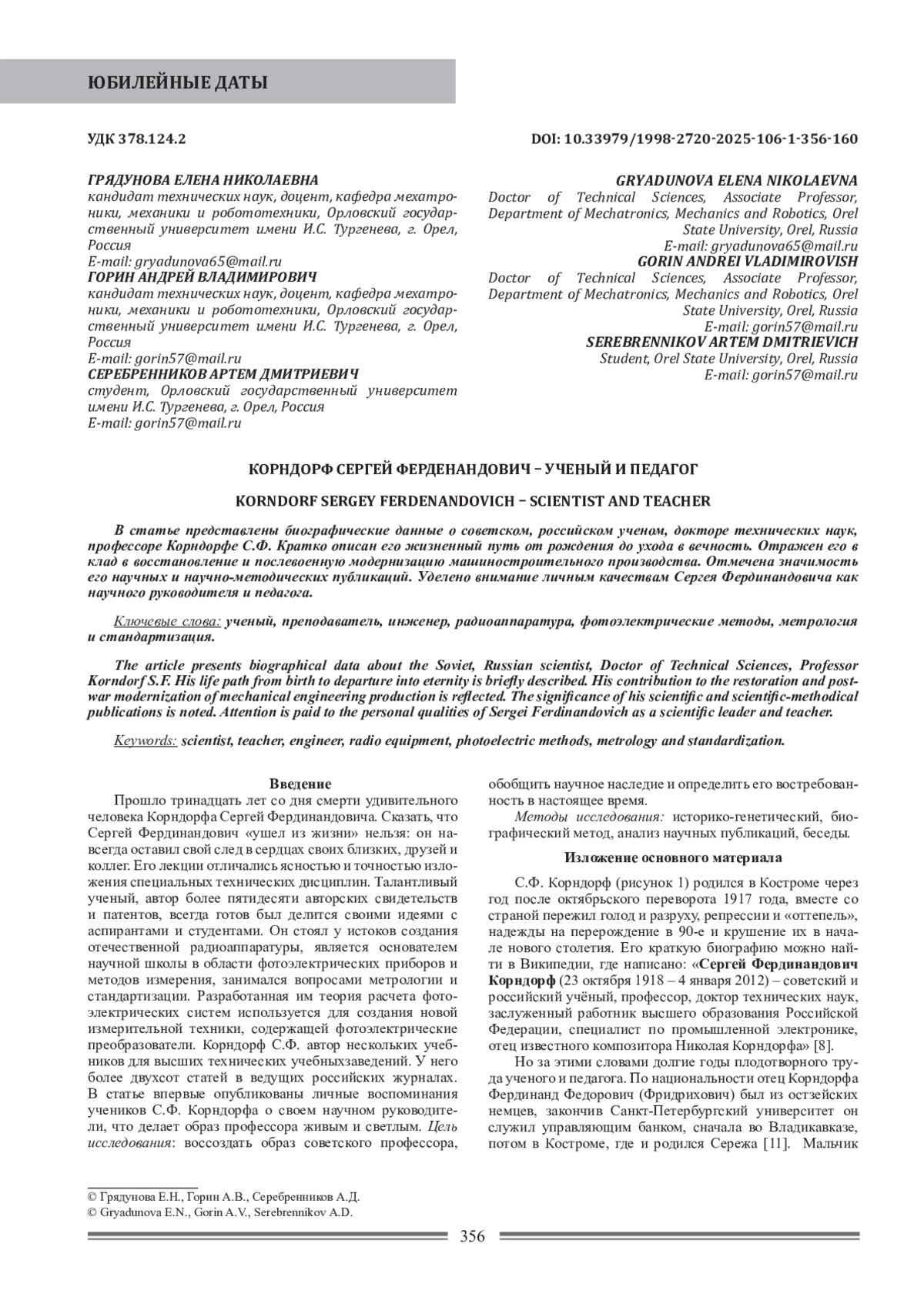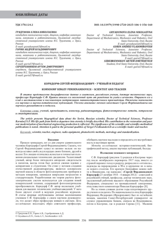 Прошло тринадцать лет со дня смерти удивительного человека Корндорфа Сергей Фердинандовича. Сказать, что Сергей Фердинандович «ушел из жизни» нельзя: он навсегда оставил свой след в сердцах своих близких, друзей и коллег. Его лекции отличались ясностью и точностью изложения специальных технических дисциплин. Талантливый ученый, автор более пятидесяти авторских свидетельств и патентов, всегда готов был делится своими идеями с аспирантами и студентами. Он стоял у истоков создания отечественной радиоаппаратуры, является основателем научной школы в области фотоэлектрических приборов и методов измерения, занимался вопросами метрологии и стандартизации. Разработанная им теория расчета фотоэлектрических систем используется для создания новой измерительной техники, содержащей фотоэлектрические преобразователи. Корндорф С. Ф. автор нескольких учебников для высших технических учебныхзаведений. У него более двухсот статей в ведущих российских журналах. В статье впервые опубликованы личные воспоминания учеников С. Ф. Корндорфа о своем научном руководители, что делает образ профессора живым и светлым.