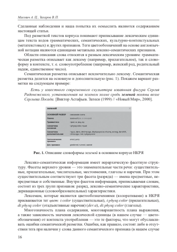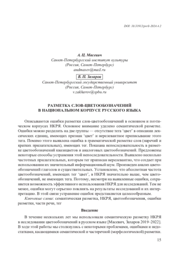 В течение нескольких лет мы использовали семантическую разметку НКРЯ в исследовании цветообозначений в русском языке [Масевич, Захаров 2019–2022]. В ходе этой работы мы столкнулись с некоторыми проблемами, ошибками и недостатками, касающимися семантической и частеречной (морфологической) разметки.