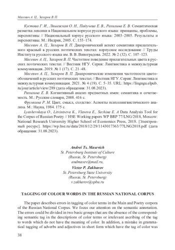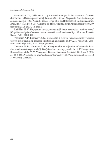 6. Захаров В. П., Масевич А. Ц. Категоризация прилагательных цвета в русских поэтических текстах (корпусное исследование) // Труды Института русского языка им. В. В. Виноградова. 2019. № 3 (21). С. 164-180. URL: http://ruslang.ru/doc/trudy/vol21/9-zacharova.pdf (дата обращения: 31.08.2023). EDN: GUVGGZ