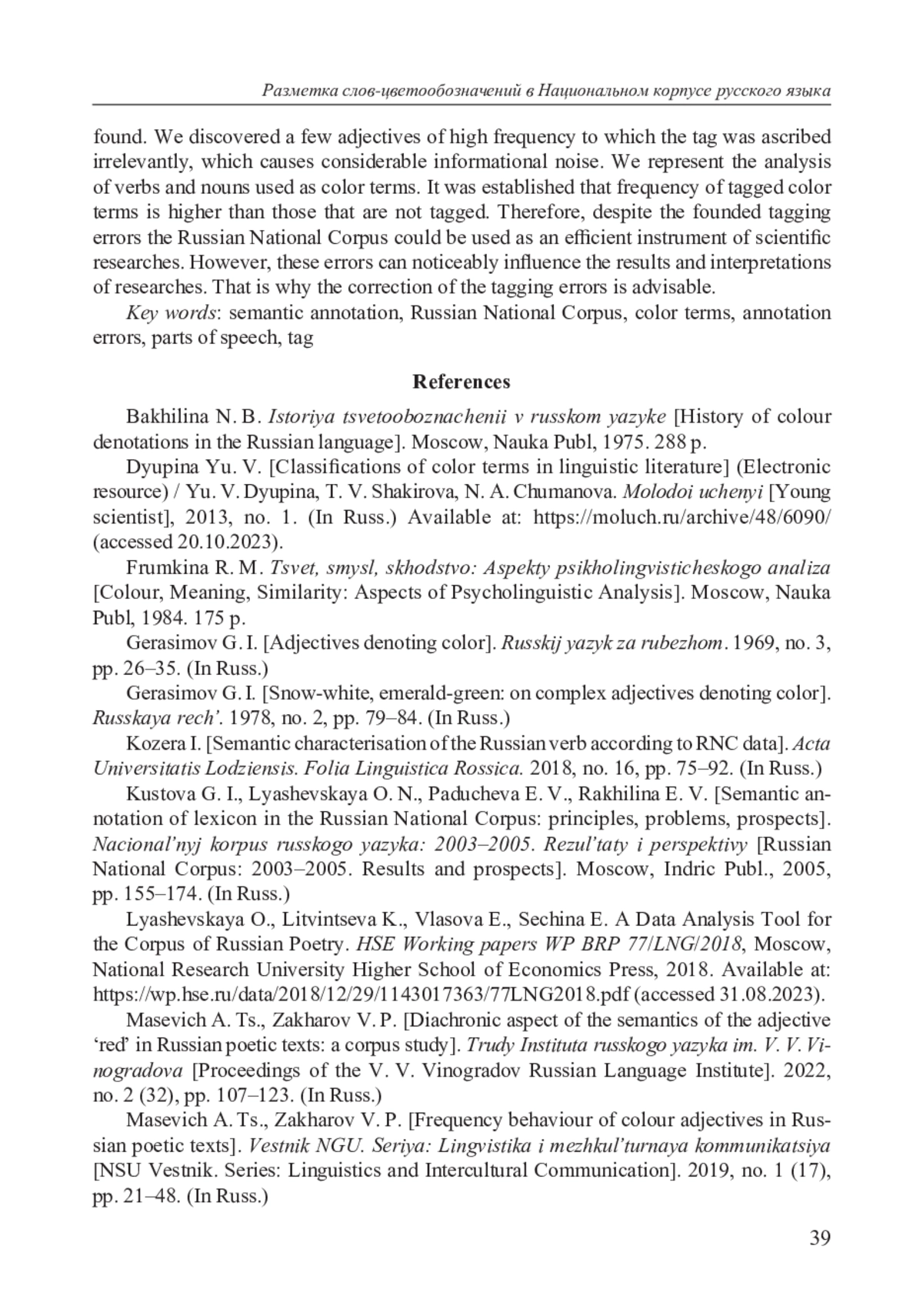 10. Масевич А. Ц., Захаров В. П. Частотное поведение прилагательных цвета в русских поэтических текстах // Вестник НГУ. Серия: Лингвистика и межкультурная коммуникация. 2019. № 1 (17). С. 21-48. EDN: YZYSIH