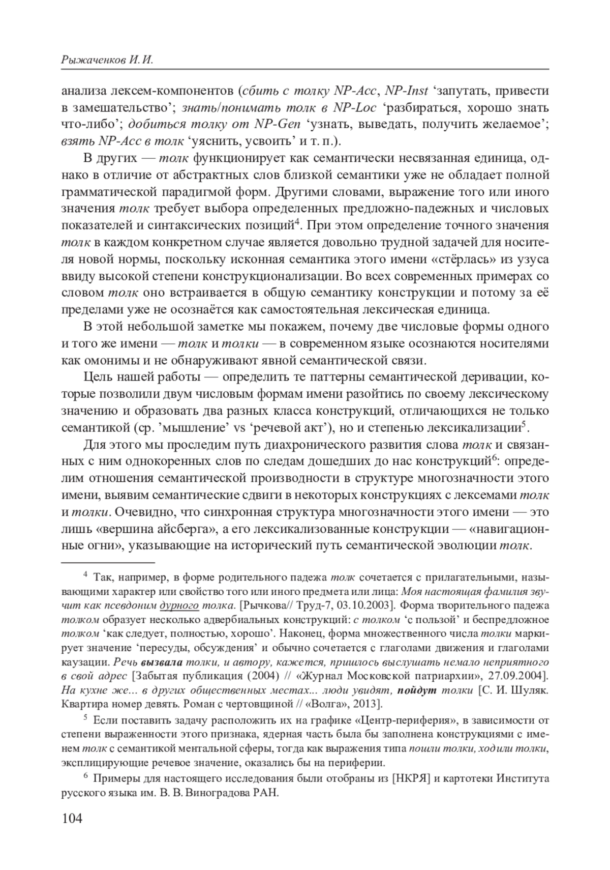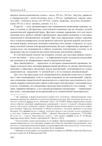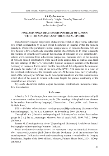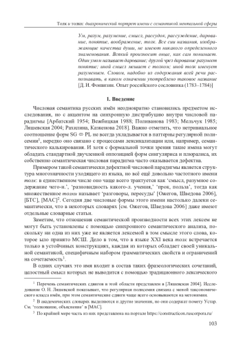 В статье исследуется процесс диахронического развития полисемии русского толк, привлёкшего наше внимание своим нетривиальным распределением лексем внутри числовой парадигмы. Несмотря на её формальную двучленность, в современном русском языке толк и толки образуют два семантически несвязанных класса конструкций. Для выявления отношений семантической производности в структуре многозначности толк семантические деривации были рассмотрены в диахронической перспективе на материале корпусных данных, а также данных картотеки Института русского языка им. В. В. Виноградова РАН. Было показано, что исконно имя толк в русском языке не обладало речевой семантикой, а получило её лишь на рубеже XVIII–XIX вв. в результате участия мотивирующего предиката толковать в новом, несвойственном ему классе конструкций. При этом само развитие полисемии толк происходило за счёт метонимических переходов и затем лексикализации, позволившей этому имени закрепиться в узусе, не смотря на постепенное выветривание исконной лексической структуры. Были отмечены и некоторые семантические сдвиги в наиболее частотных конструкциях с лексемами толк и толки, которые повлияли на их синхронную сочетаемость; исследован процесс лексической конкуренции с ближайшими коррелятами — заимствованиями и кальками. Рассмотренный путь семантической эволюции слов с корнем толк позволяют говорить о явлении конструкционного «принуждения» (coercion) как об одном из паттернов диахронического развития русской абстрактной лексики.