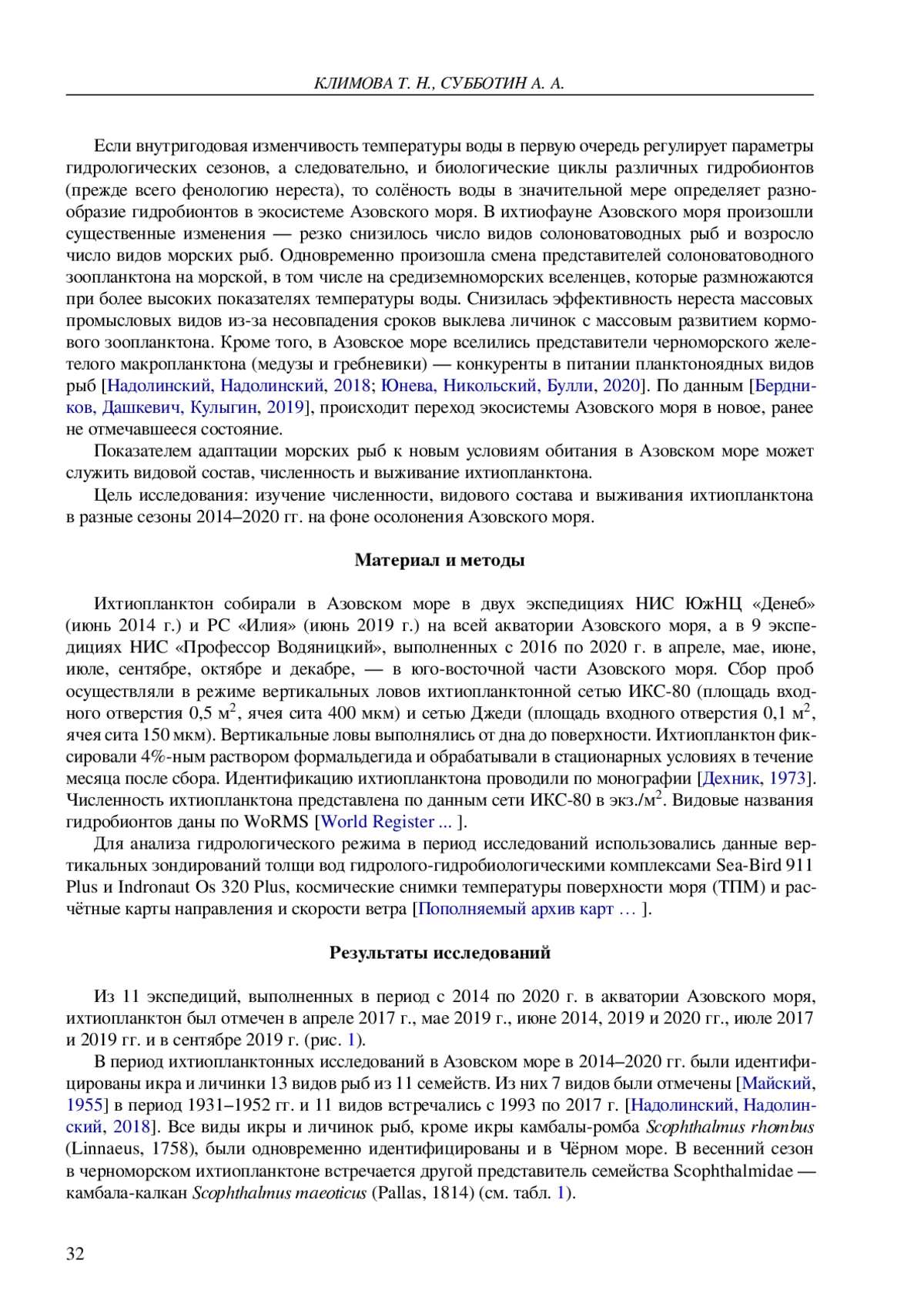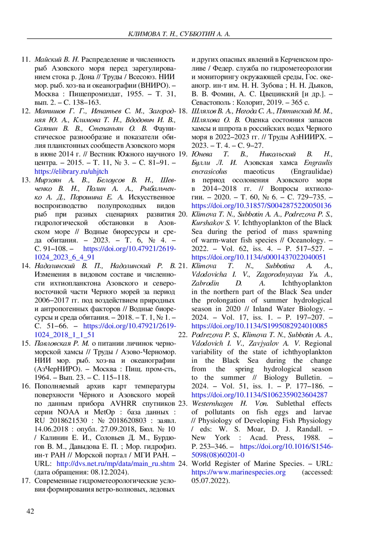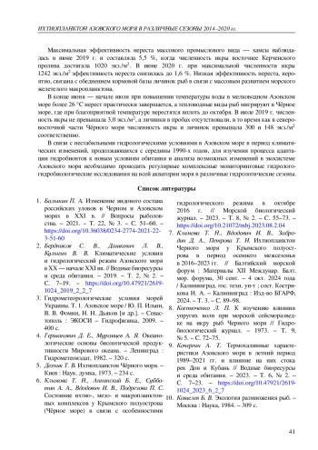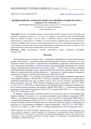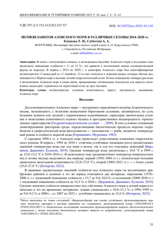 20. Klimova T. N., Subbotin A. A., Podrezova P. S., Kurshakov S. V. Ichthyoplankton of the Black Sea during the period of mass spawning of warm-water fish species // Oceanology. - 2022. - Vol. 62, iss. 4. - P. 517-527. -. DOI: 10.1134/s0001437022040051 EDN: JJLMDR