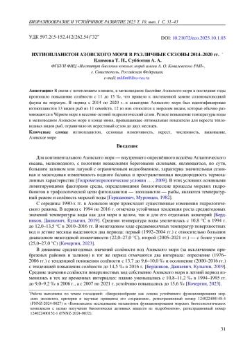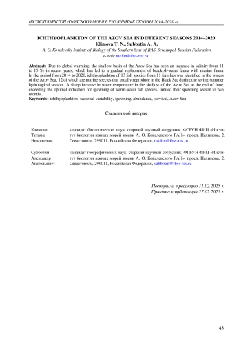 21. Klimova T. N., Subbotin A. A., Vdodovich I. V., Zagorodnyaya Yu. A., Zabrodin D. A. Ichthyoplankton in the northern part of the Black Sea under the prolongation of summer hydrological season in 2020 // Inland Water Biology. - 2024. - Vol. 17, iss. 1. - P. 197-207. -. DOI: 10.1134/S1995082924010085 EDN: YXAFSM