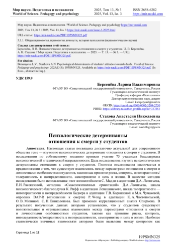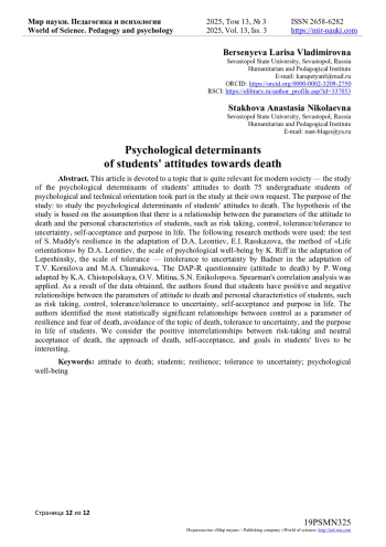 Настоящая статья посвящена достаточно актуальной для современного общества теме - изучению психологических детерминант отношения к смерти у студентов. В исследовании по собственному желанию приняли участие 75 учащихся бакалавриата психологической и технической направленности.
