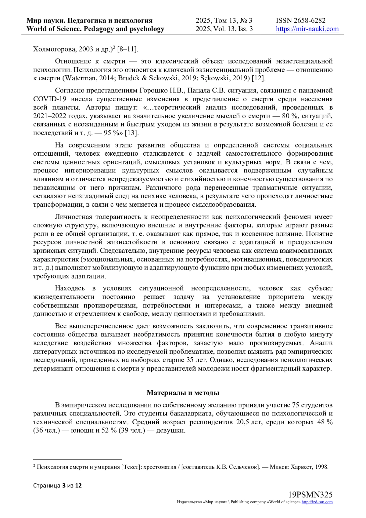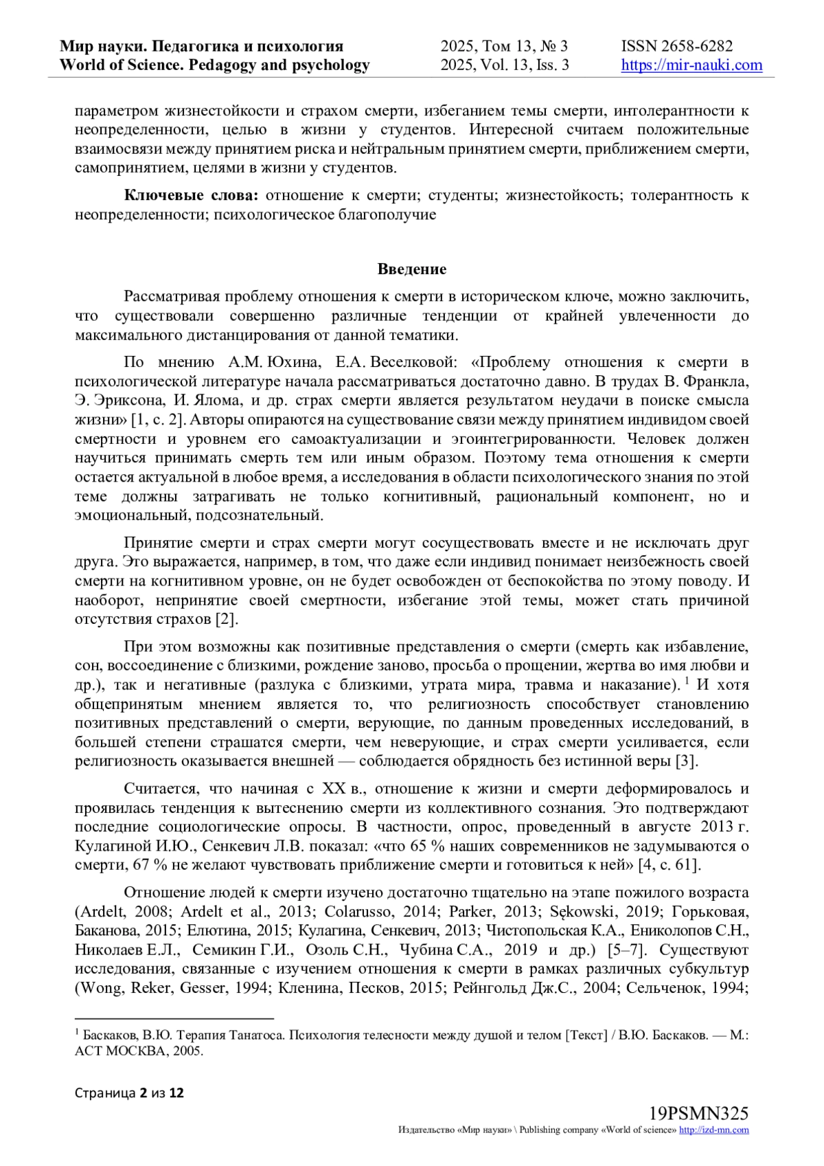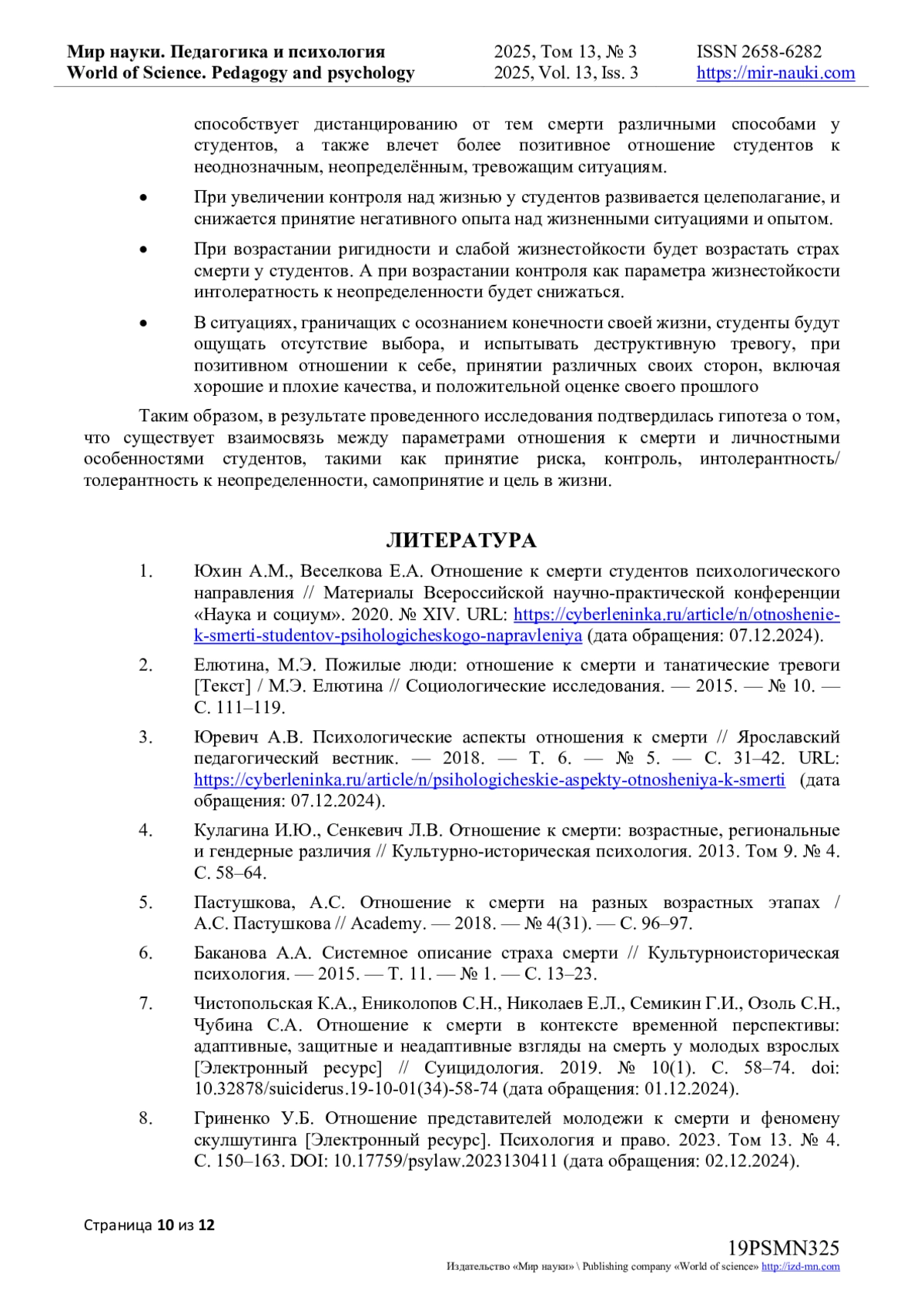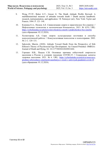 7. Чистопольская К.А., Ениколопов С.Н., Николаев Е.Л., Семикин Г.И., Озоль С.Н., Чубина С.А. Отношение к смерти в контексте временной перспективы: адаптивные, защитные и неадаптивные взгляды на смерть у молодых взрослых [Электронный ресурс] // Суицидология. 2019. № 10(1). С. 58-74. 10.32878/suiciderus.19-10-01(34)-58-74 (дата обращения: 01.12.2024). DOI: 10.32878/suiciderus.19-10-01(34)-58-74( EDN: BHXKEZ