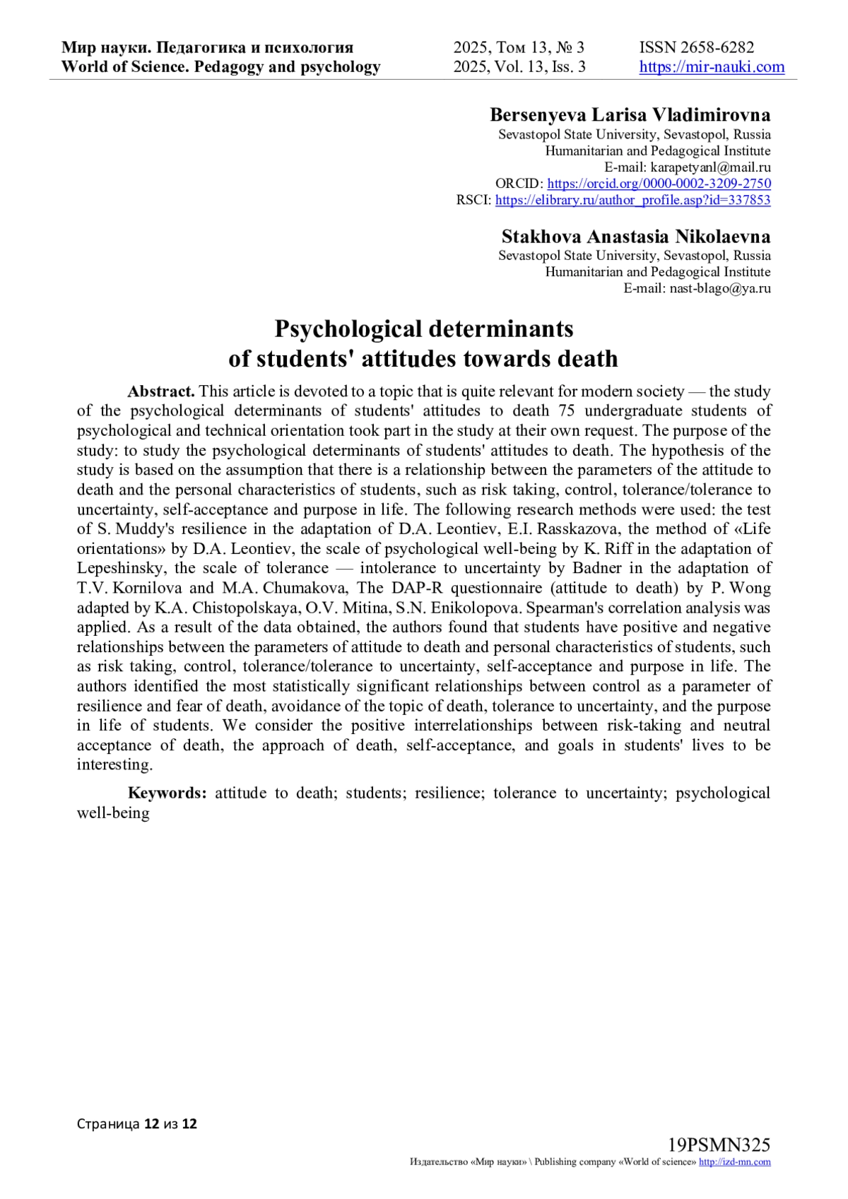 В результате полученных данных авторами установлено, что у студентов существуют положительные и отрицательные взаимосвязи между параметрами отношения к смерти и личностными особенностями студентов, такими как принятие риска, контроль, интолерантность/толерантность к неопределенности, самопринятие и цель в жизни. Наиболее статистически значимые взаимосвязи авторами были выявлены между контролем как параметром жизнестойкости и страхом смерти, избеганием темы смерти, интолерантности к неопределенности, целью в жизни у студентов. Интересной считаем положительные взаимосвязи между принятием риска и нейтральным принятием смерти, приближением смерти, самопринятием, целями в жизни у студентов.