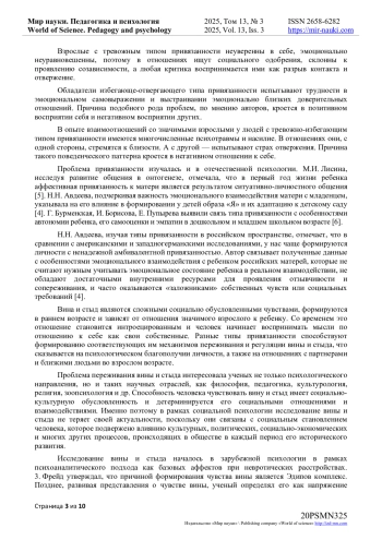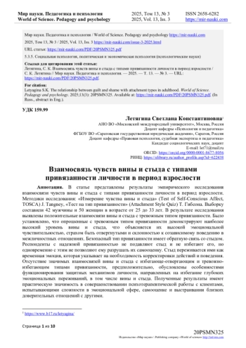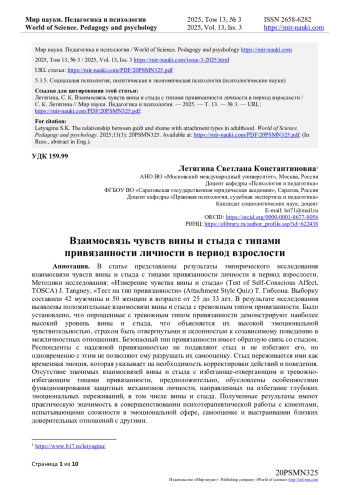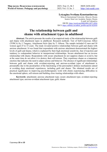 В результате исследования выявлены положительные взаимосвязи вины и стыда с тревожным типом привязанности. Было установлено, что опрошенные с тревожным типом привязанности демонстрируют наиболее высокий уровень вины и стыда, что объясняется их высокой эмоциональной чувствительностью, страхом быть отвергнутыми и склонностью к созависимому поведению в межличностных отношениях. Безопасный тип привязанности имеет обратную связь со стыдом. Респонденты с надежной привязанностью не подавляют стыд и не избегают его, но одновременно с этим не позволяют ему разрушать их самооценку. Стыд переживается ими как временная эмоция, которая указывает на необходимость корректировки действий и поведения. Отсутствие значимых взаимосвязей вины и стыда с избегающе-отвергающим и тревожно-избегающим типами привязанности, предположительно, обусловлены особенностями функционирования защитных механизмов личности, направленных на избегание глубоких эмоциональных переживаний, в том числе вины и стыда.