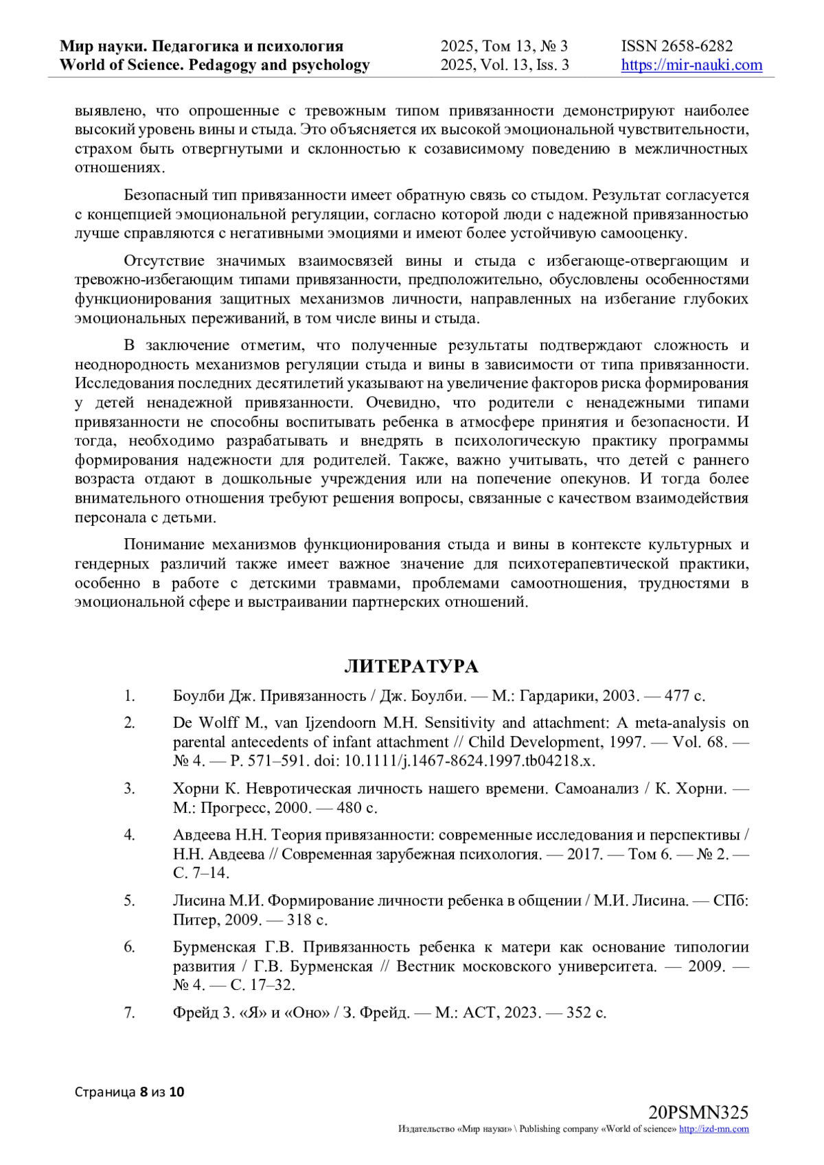 6. Бурменская Г.В. Привязанность ребенка к матери как основание типологии развития / Г.В. Бурменская // Вестник московского университета. - 2009. - № 4. - С. 17-32.
