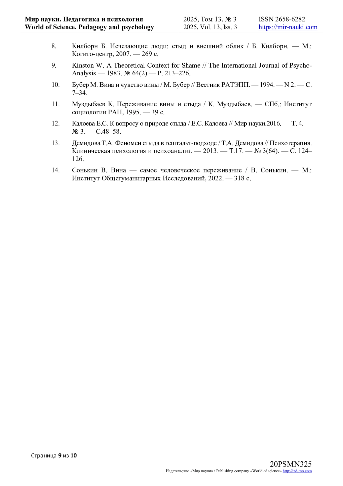 11. Муздыбаев К. Переживание вины и стыда / К. Муздыбаев. - СПб.: Институт социологии РАН, 1995. - 39 с. EDN: SUFRMR