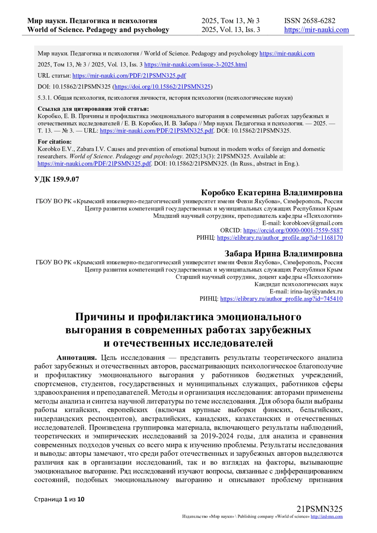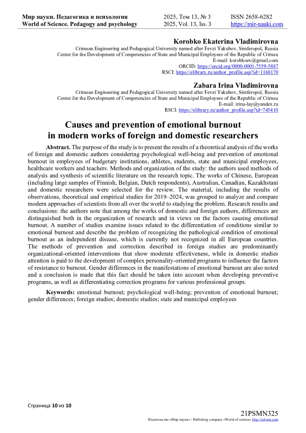 Результаты исследования и выводы: авторы замечают, что среди работ отечественных и зарубежных авторов выделяются различия как в организации исследований, так и во взглядах на факторы, вызывающие эмоциональное выгорание. Ряд исследований изучают вопросы, связанные с дифференцированием состояний, подобных эмоциональному выгоранию и описывают проблему признания патологического состояния эмоционального выгорания самостоятельным заболеванием, которое на сегодняшний день признано не во всех европейских странах. Описанными способами профилактики и коррекции в зарубежных исследованиях представляются преимущественно организационно-направленные вмешательства, показывающие умеренную эффективность, в то время как в отечественных исследованиях внимание уделяется разработке комплексных личностно-ориентированных программ для влияния на факторы устойчивости к выгоранию. Также отмечены гендерные различия в проявлениях эмоционального выгорания и делается вывод, что данные факт стоит учитывать при разработке профилактических программ, как и дифференцирование коррекционных программ для различных профессиональных групп.