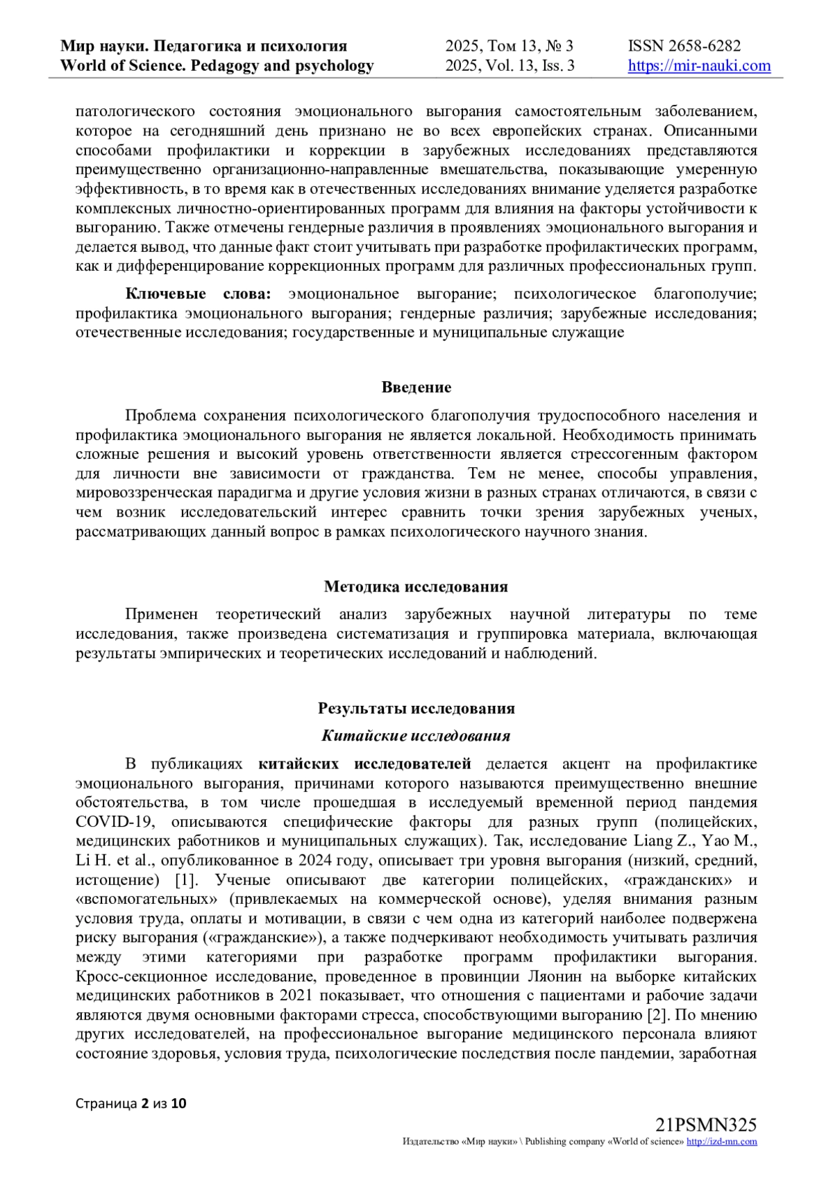 1. Liang, Z. How does the double-track human resource management model contribute to job burnout and mental health among Chinese government departments? A Chinese police study / Z. Liang, M. Yao, H. Li [et al.] // Frontiers in Public Health. - 2024. - Vol. 12. - P. 1423103. -. DOI: 10.3389/fpubh.2024.1423103 EDN: VNPWYD