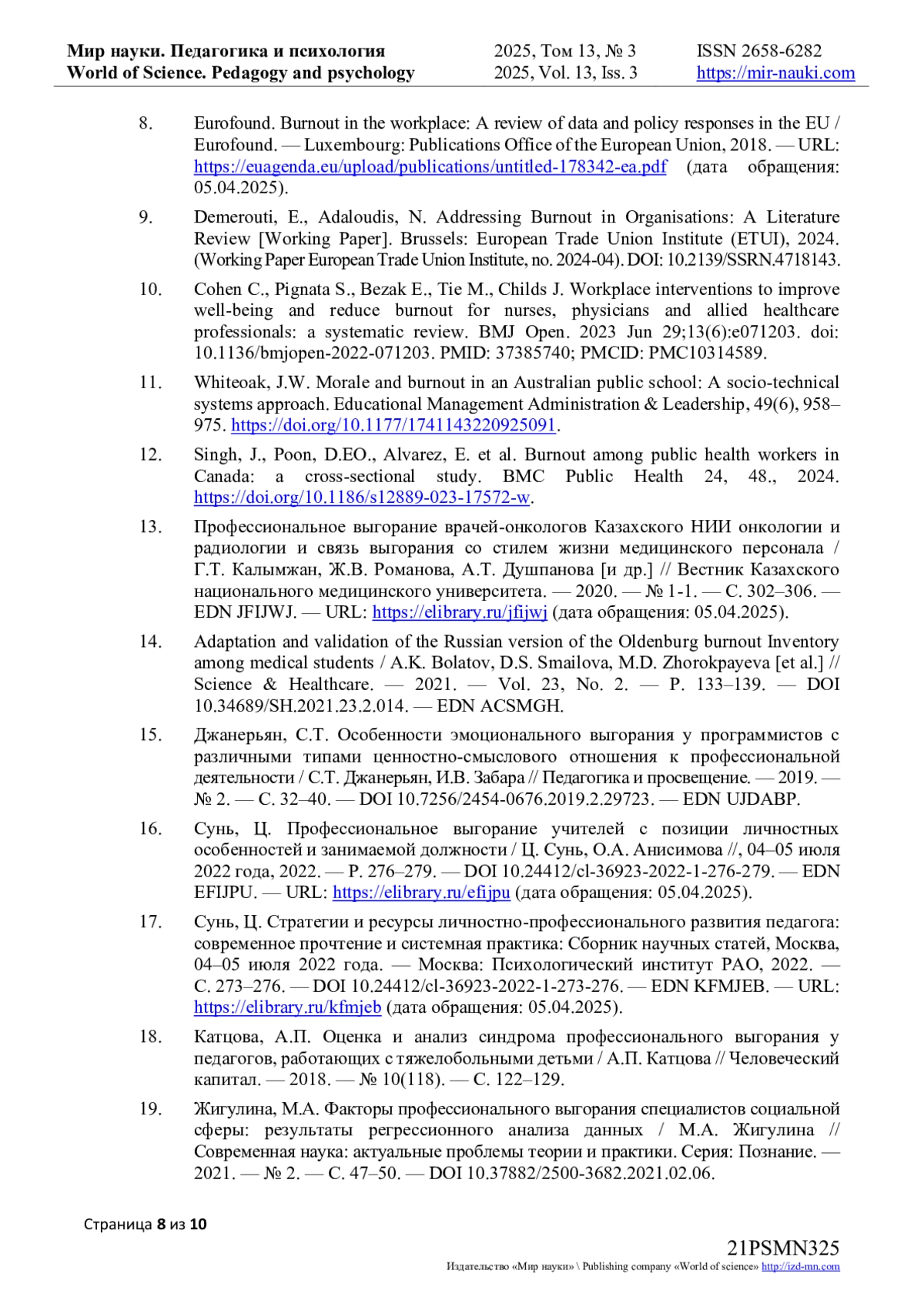 8. Eurofound. Burnout in the workplace: A review of data and policy responses in the EU / Eurofound. - Luxembourg: Publications Office of the European Union, 2018. - URL: https://euagenda.eu/upload/publications/untitled-178342-ea.pdf (дата обращения: 05.04.2025).