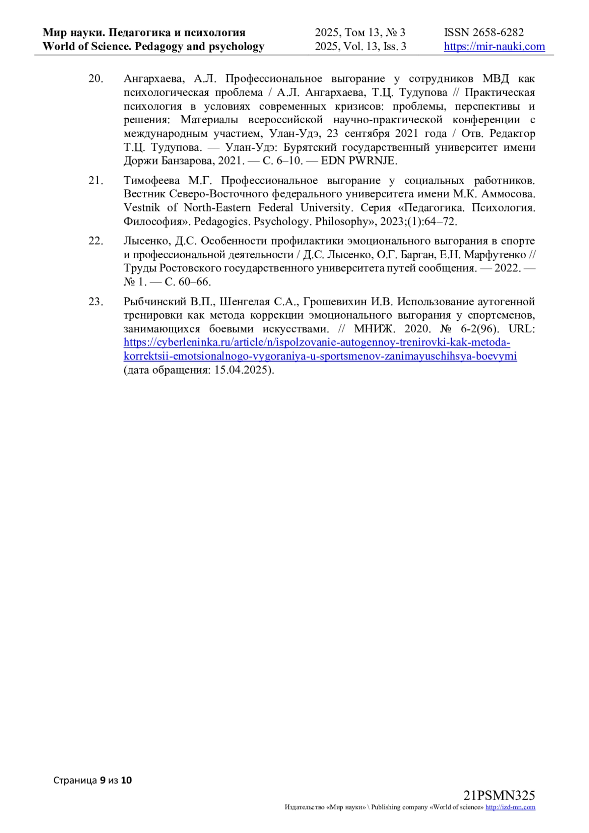 22. Лысенко, Д.С. Особенности профилактики эмоционального выгорания в спорте и профессиональной деятельности / Д.С. Лысенко, О.Г. Барган, Е.Н. Марфутенко // Труды Ростовского государственного университета путей сообщения. - 2022. - № 1. - С. 60-66. EDN: ARMHOG