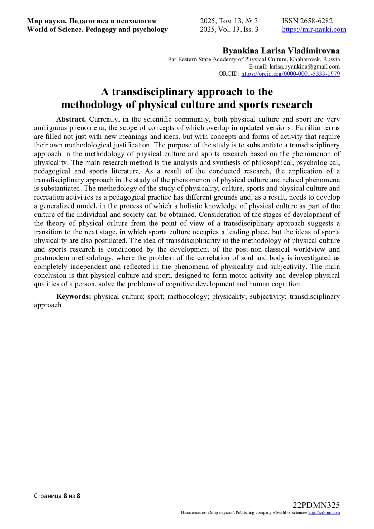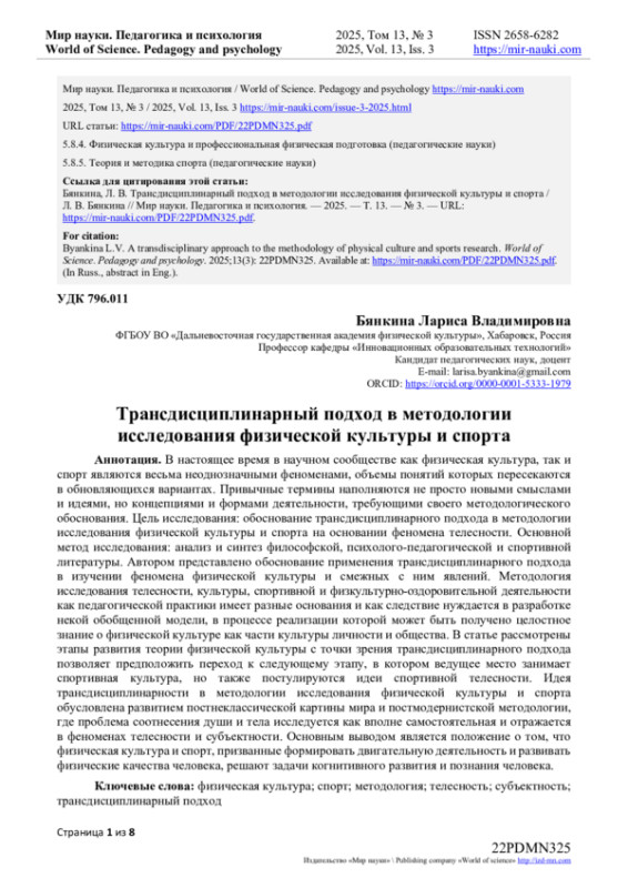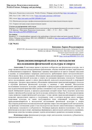 Цель исследования: обоснование трансдисциплинарного подхода в методологии исследования физической культуры и спорта на основании феномена телесности. Основной метод исследования: анализ и синтез философской, психолого-педагогической и спортивной литературы. Автором представлено обоснование применения трансдисциплинарного подхода в изучении феномена физической культуры и смежных с ним явлений.
