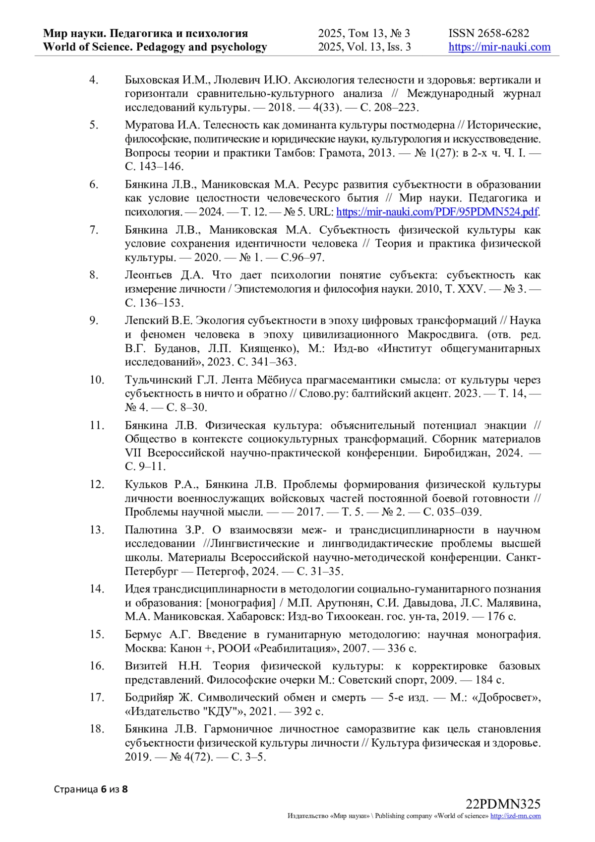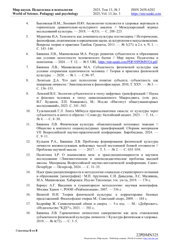 6. Бянкина Л.В., Маниковская М.А. Ресурс развития субъектности в образовании как условие целостности человеческого бытия // Мир науки. Педагогика и психология. - 2024. - Т. 12. - № 5. URL: https://mir-nauki.com/PDF/95PDMN524.pdf. EDN: ILUWUQ