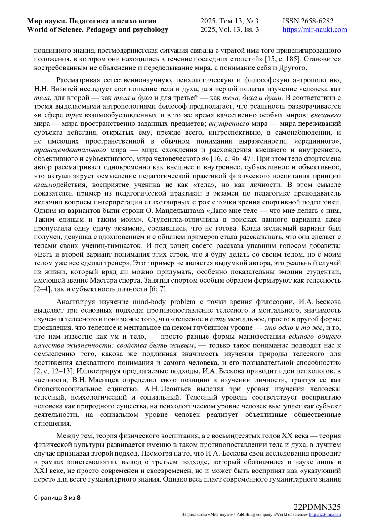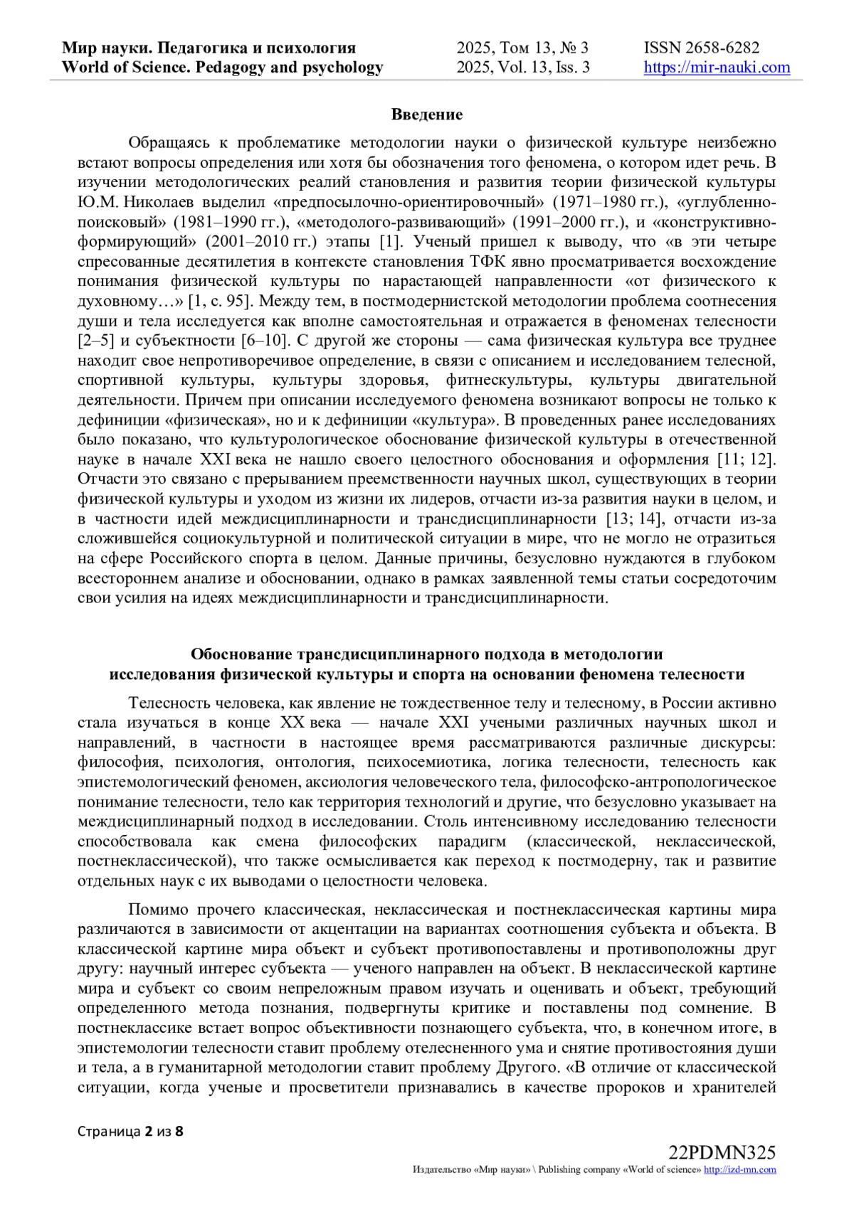 3. Бянкина Л.В., Хотимченко А.В., Дрокова В.А. Роль адаптивного спорта в социальной ситуации развития нетипичной телесности // Мир науки. Педагогика и психология. - 2025. - Т 13. - № 1. - URL: https://mir-nauki.com/PDF/78PDMN125.pdf (дата обращения: 01.05.2025). EDN: RRFFSB