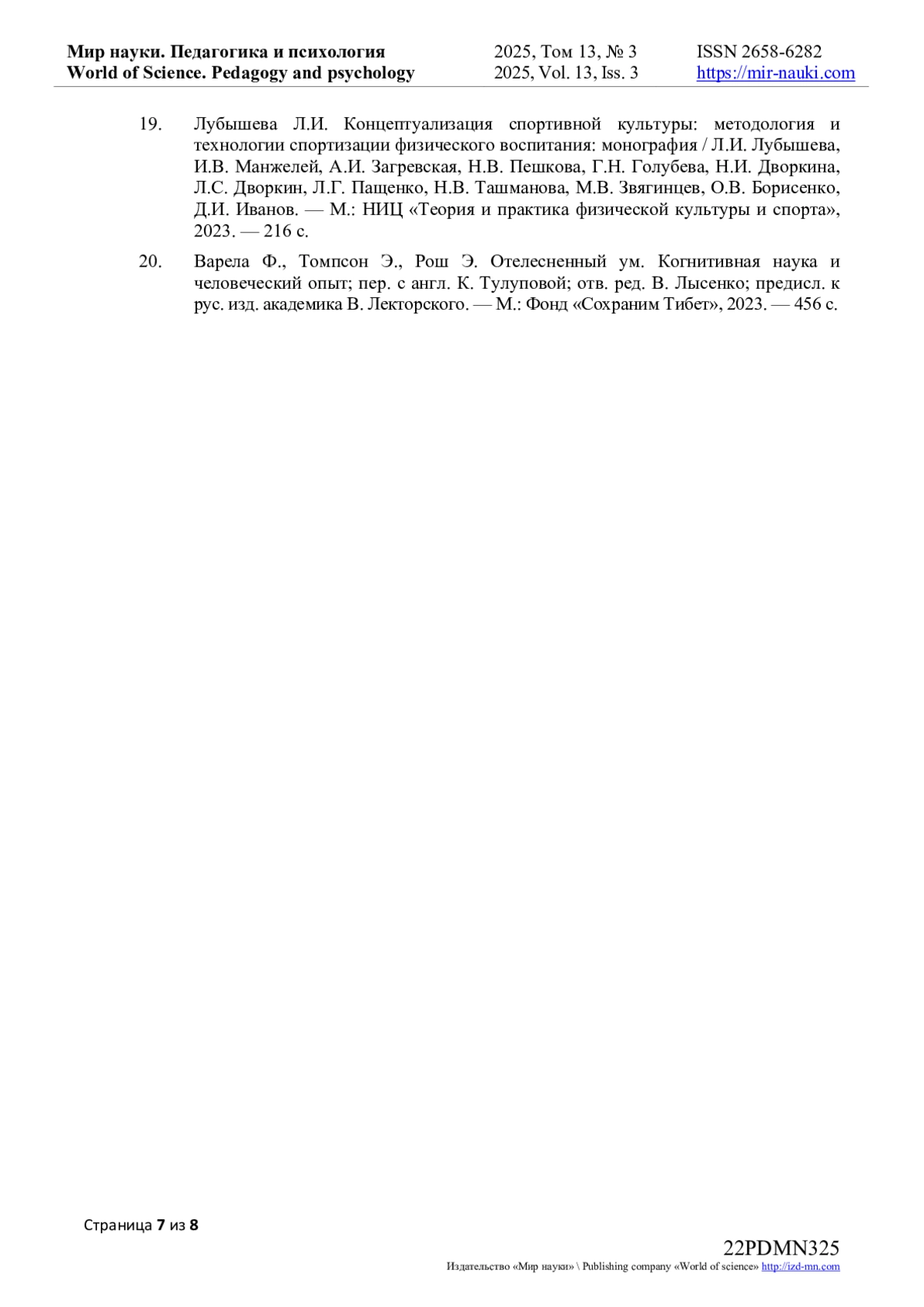 19. Лубышева Л.И. Концептуализация спортивной культуры: методология и технологии спортизации физического воспитания: монография / Л.И. Лубышева, И.В. Манжелей, А.И. Загревская, Н.В. Пешкова, Г.Н. Голубева, Н.И. Дворкина, Л.С. Дворкин, Л.Г. Пащенко, Н.В. Ташманова, М.В. Звягинцев, О.В. Борисенко, Д.И. Иванов. - М.: НИЦ “Теория и практика физической культуры и спорта”, 2023. - 216 с. EDN: LJRMRO