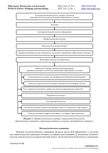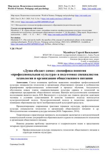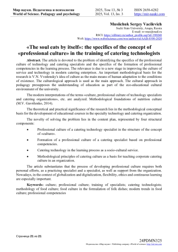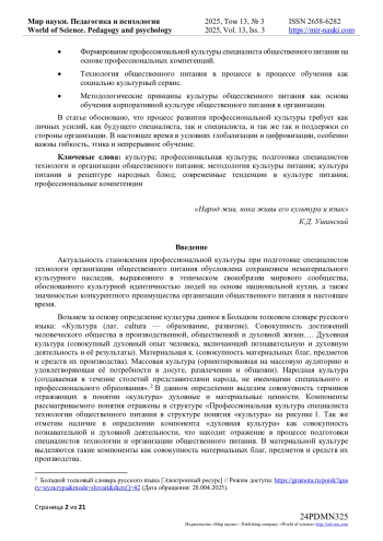 Статья посвящена проблеме выявления специфики профессиональной культуры специалистов технологии и организации общественного питания и особенностям формирования профессиональных компетенций в процессе обучения. Актуальность обусловлена новым этапом совершенствование культуры сервиса и технологий на современных предприятиях общественного питания. Важным методологическим основанием исследования является мысль В. Н. Введенского о культуре как главном средство адаптации человека к условиям существования В качестве основного подхода используется культурологический подход. Культурологический подход в педагогике предполагает понимание образования как части экообразовательной культурной среды вуза.