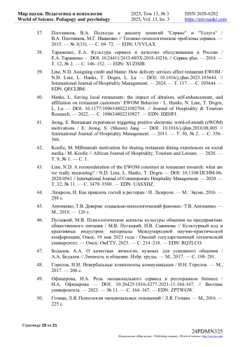 40. Hanks, L. Saving local restaurants: the impact of altruism, self-enhancement, and affiliation on restaurant customers’ EWOM Behavior / L. Hanks, N. Line, T. Dogru, L. Lu - // Journal of Hospitality & Tourism Research. - 2022. - С. 109634802210927. -. DOI: 10.1177/10963480221092704 EDN: IDDJFJ