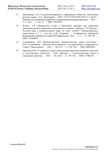 51. Димитриева, О.А. Гастрокоммуникация в современном обществе: неологизмы русского языка / О.А. Димитриева - // Научные исследования и разработки. Современная коммуникативистика. - 2022. - Т. 11, № 1. - С. 46-52. -. DOI: 10.12737/2587-9103-2022-11-1-46-52 EDN: VWPTNT