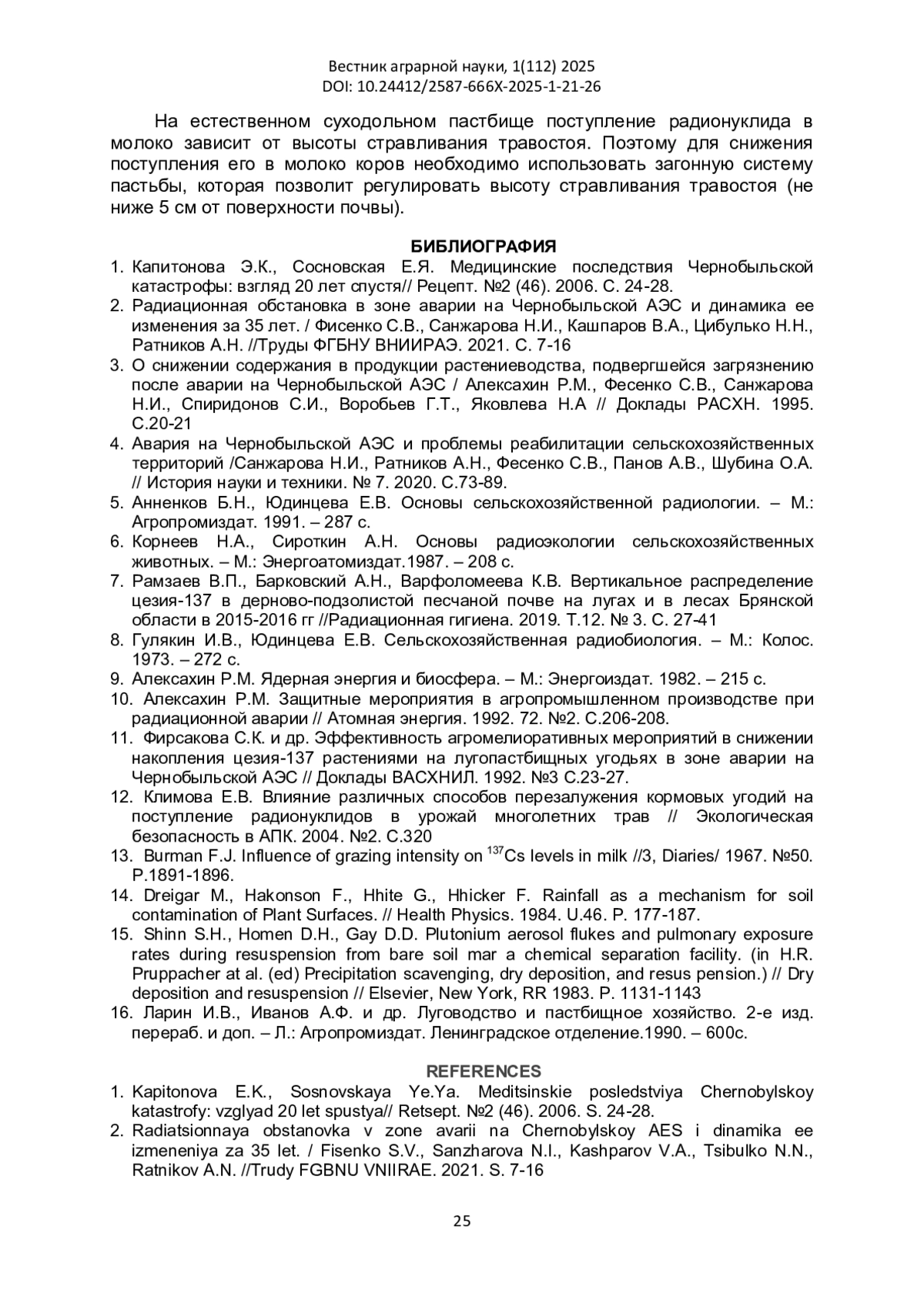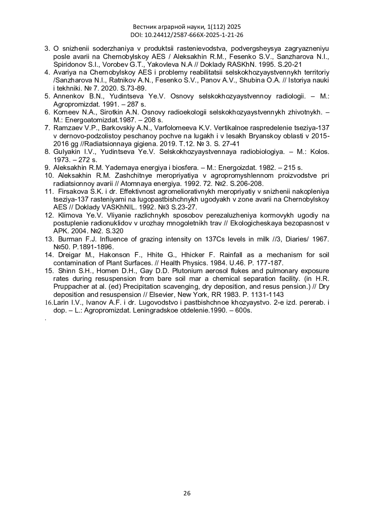 11. Фирсакова С.К. и др. Эффективность агромелиоративных мероприятий в снижении накопления цезия-137 растениями на лугопастбищных угодьях в зоне аварии на Чернобыльской АЭС // Доклады ВАСХНИЛ. 1992. №3 С.23-27.