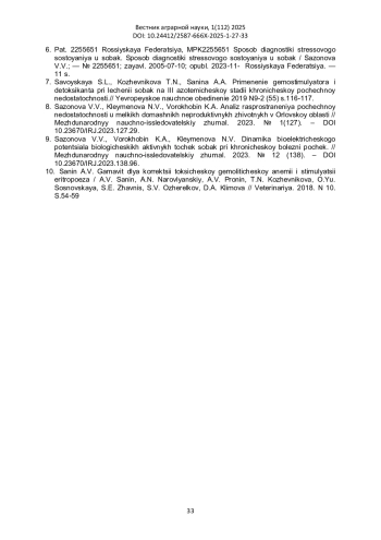 8. Сазонова В.В., Клейменова Н.В., Ворохобин К.А. Анализ распространения почечной недостаточности у мелких домашних непродуктивных животных в Орловской области // Международный научно-исследовательский журнал. 2023. № 1(127). DOI: 10.23670/IRJ.2023.127.29 EDN: MQTXSG